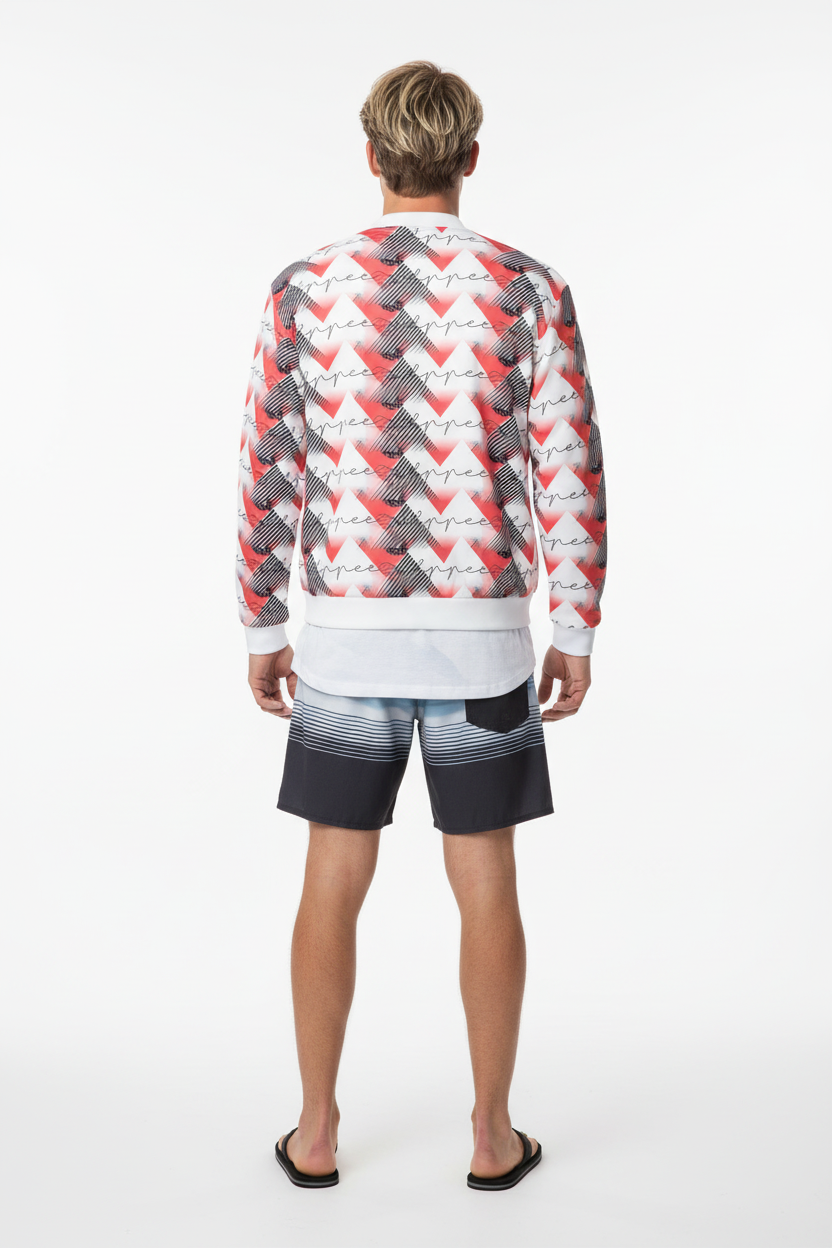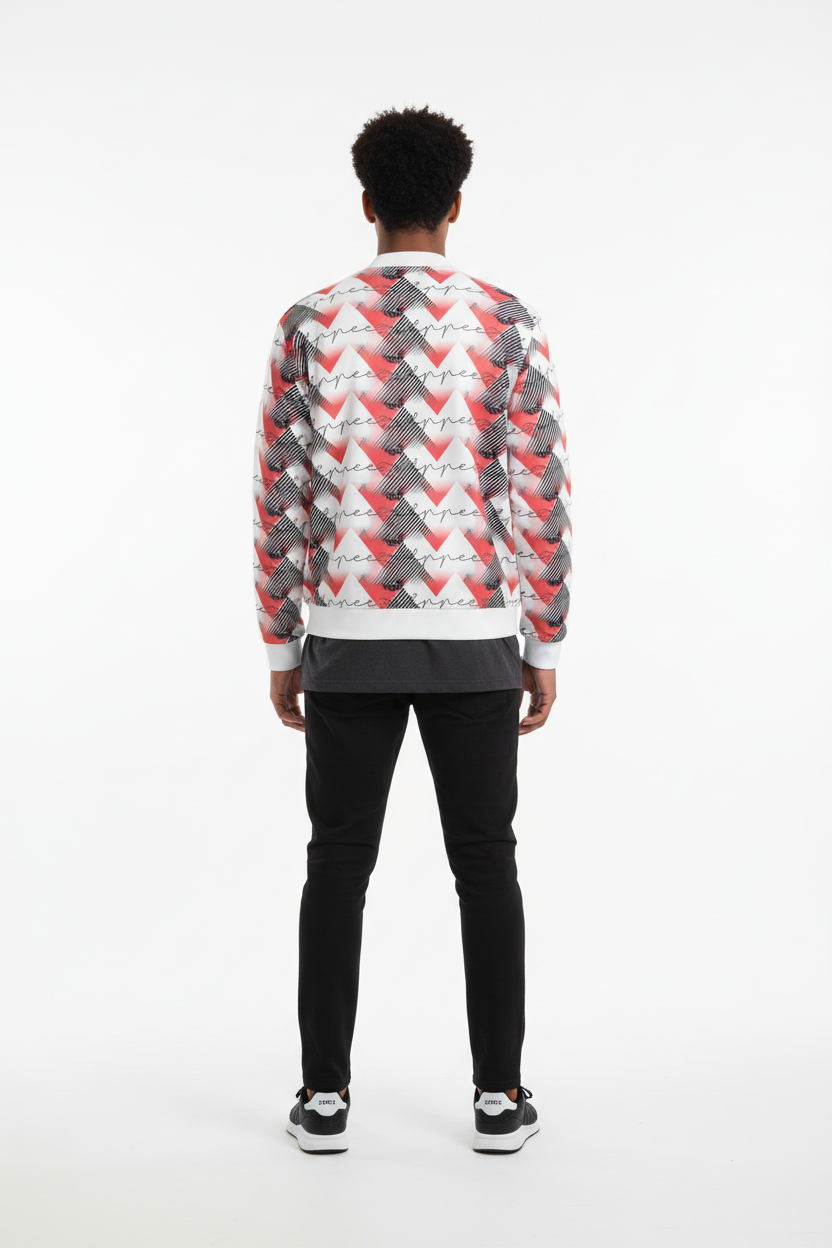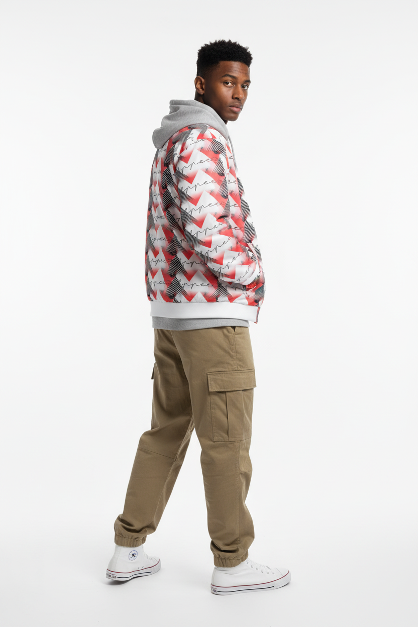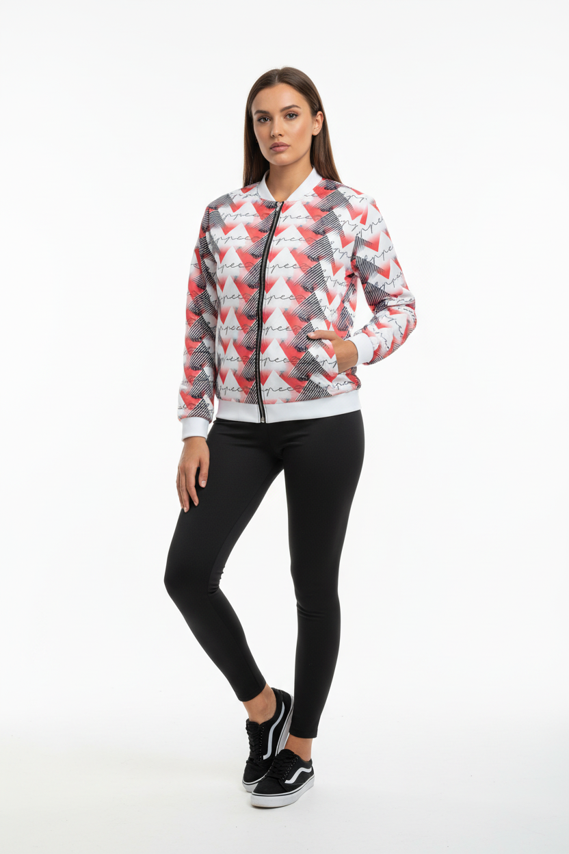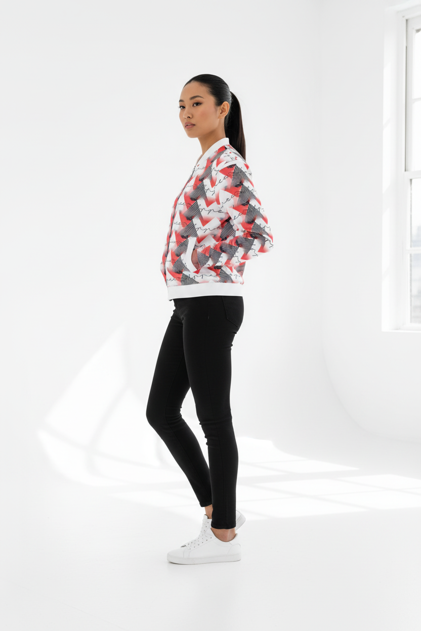 Introducing the Alppeer Signature Geometric Bomber Jacket—where contemporary design meets classic comfort. Featuring a striking red, navy, and white geometric pattern with diagonal stripes and the Alppeer script woven throughout, this isn't just a jacket; it's a statement of confidence and style.