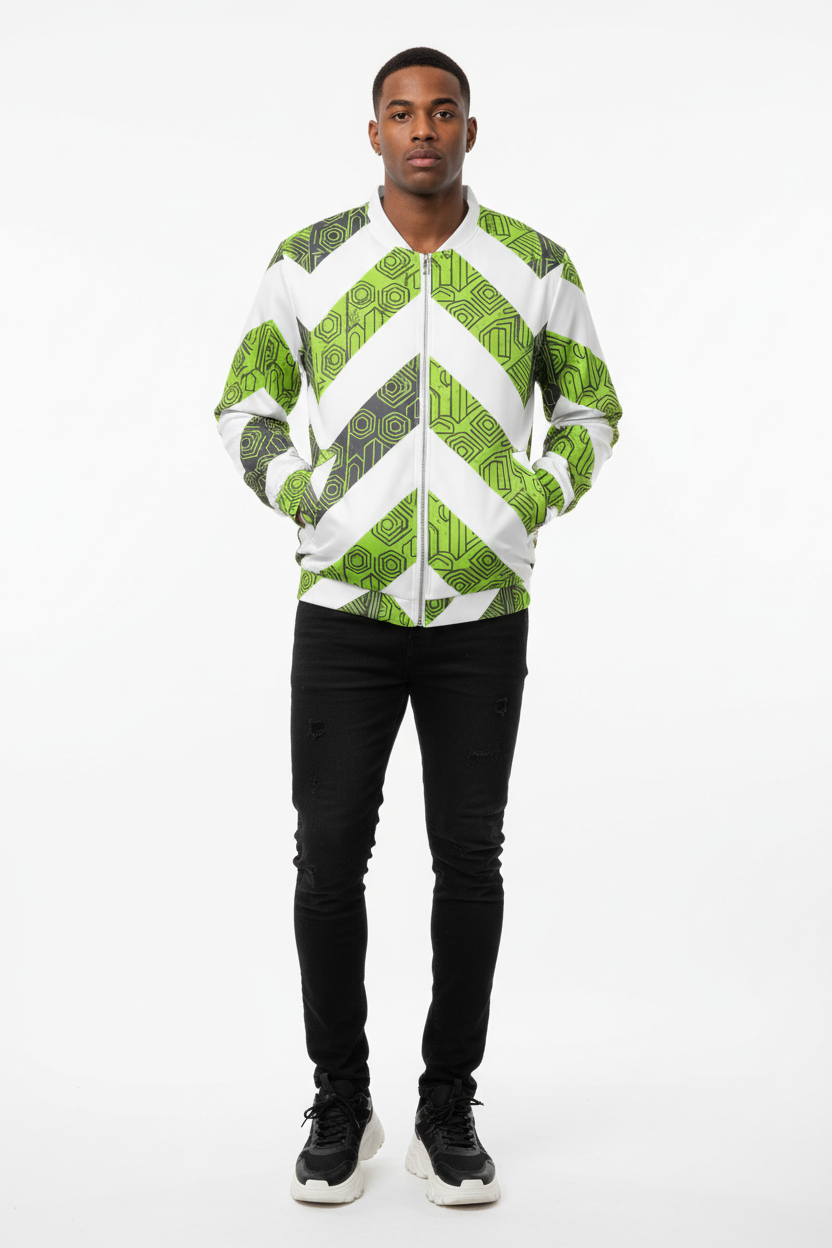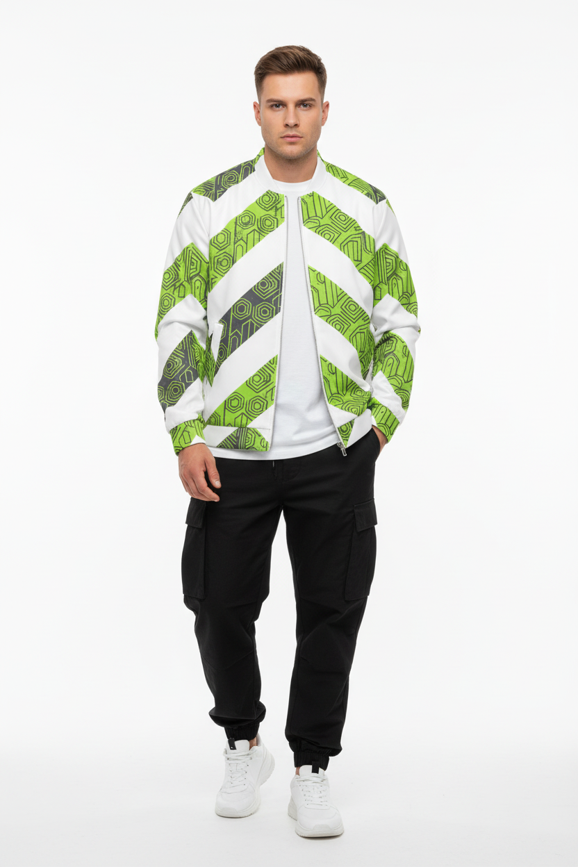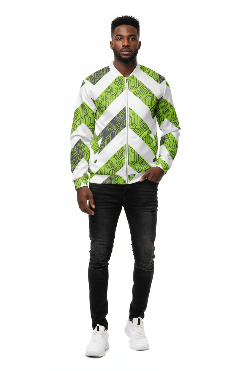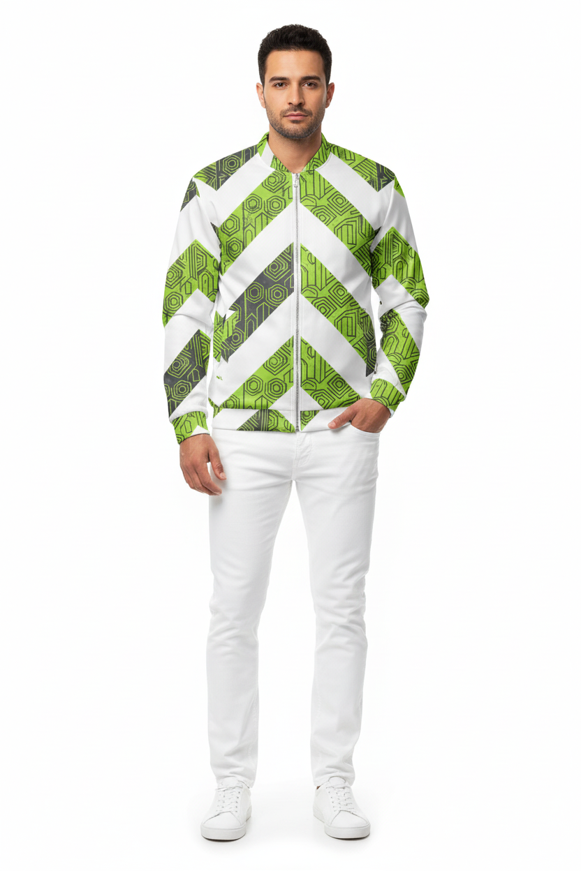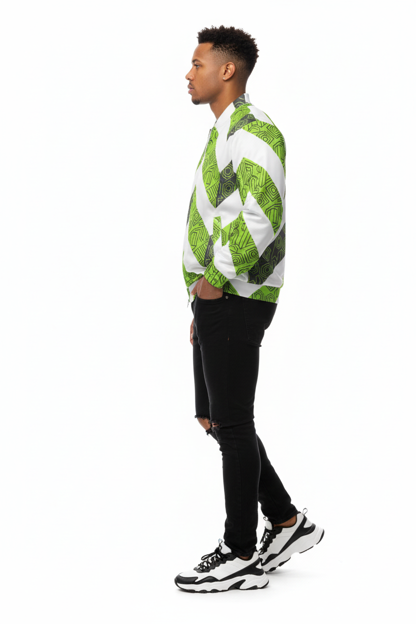 Elevate your streetwear game with this electrifying neon geo bomber jacket featuring bold electric green and white geometric patterns. Designed for those who command attention, this jacket brings futuristic energy and premium craftsmanship to your wardrobe.