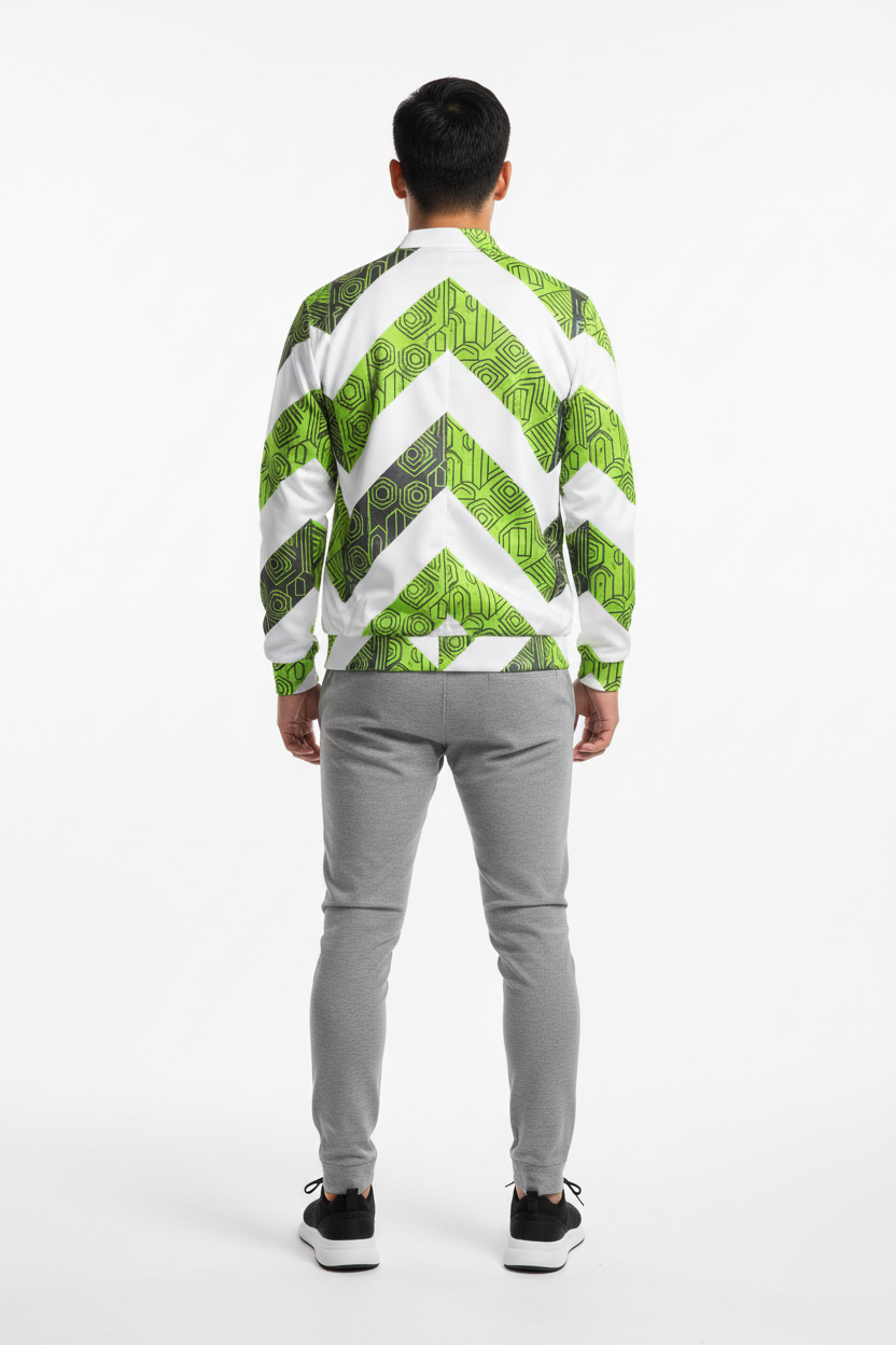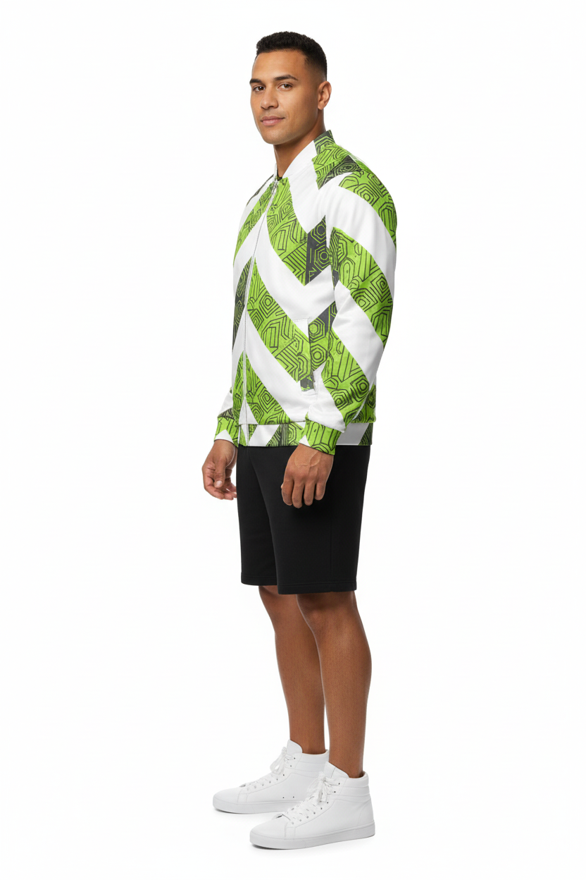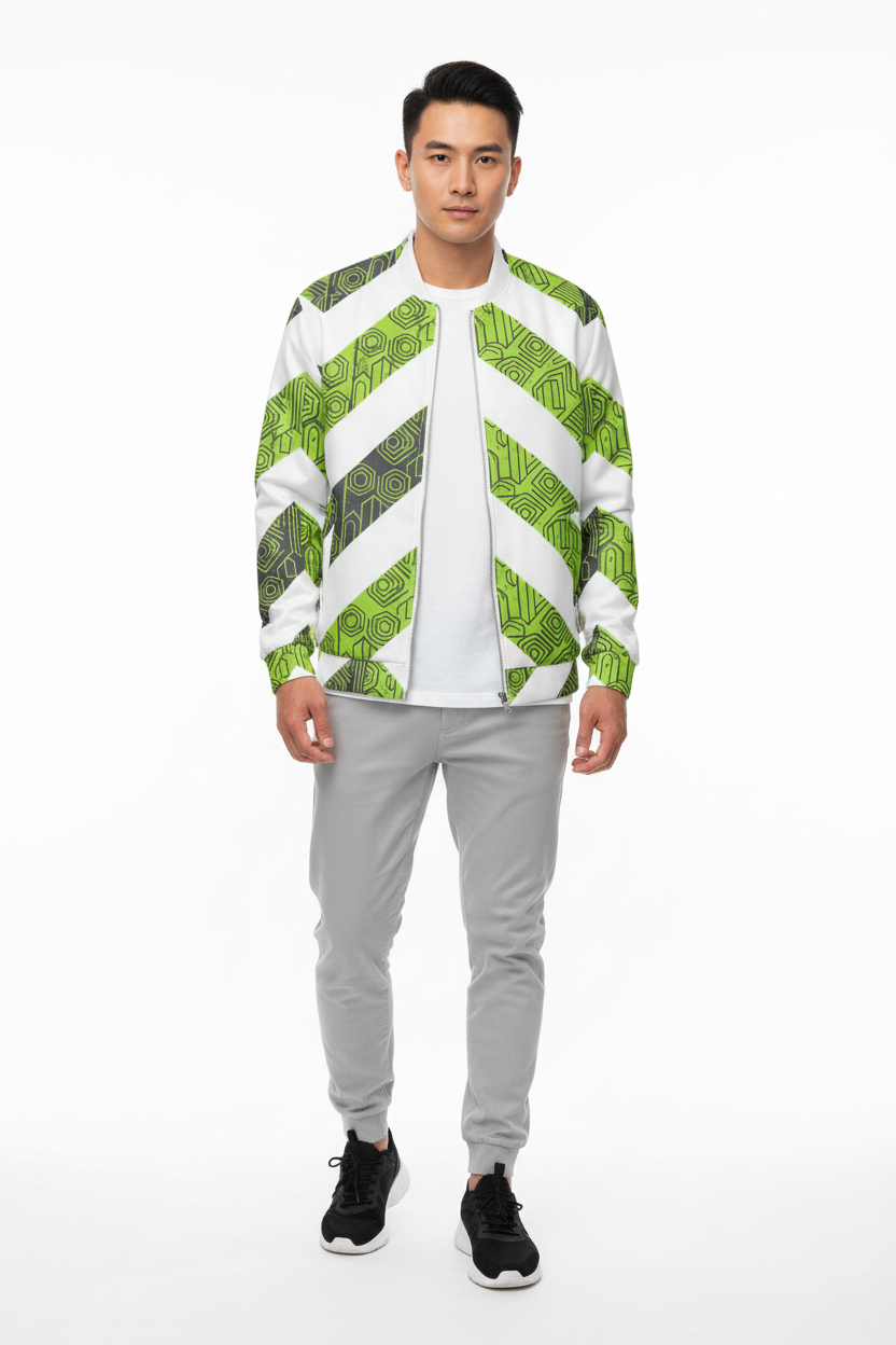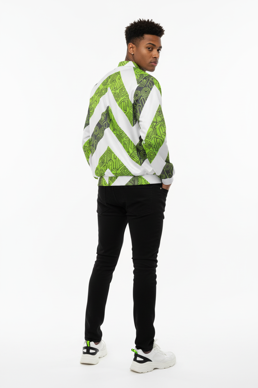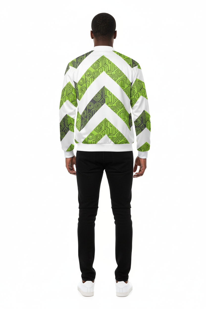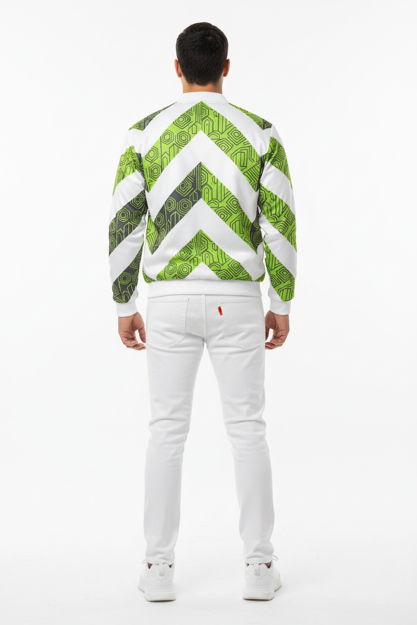 Elevate your streetwear game with this electrifying neon geo bomber jacket featuring bold electric green and white geometric patterns. Designed for those who command attention, this jacket brings futuristic energy and premium craftsmanship to your wardrobe.