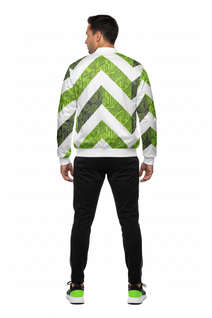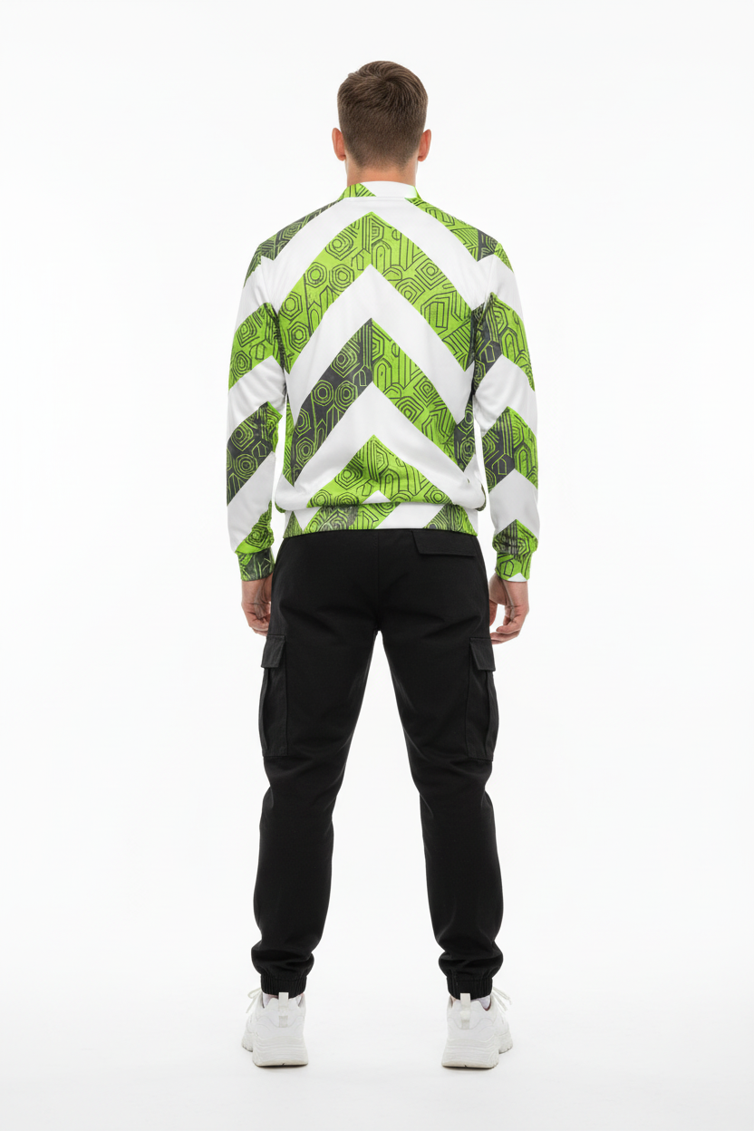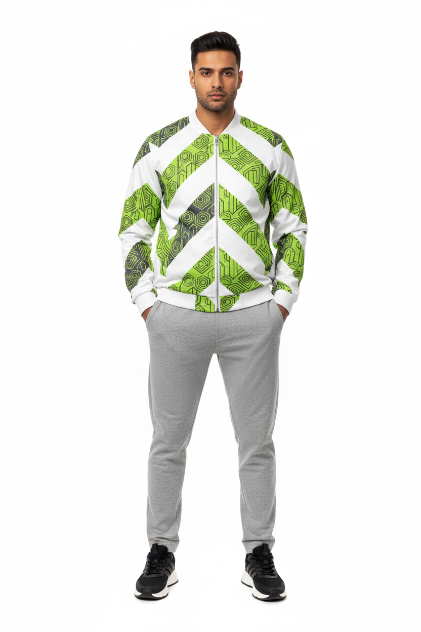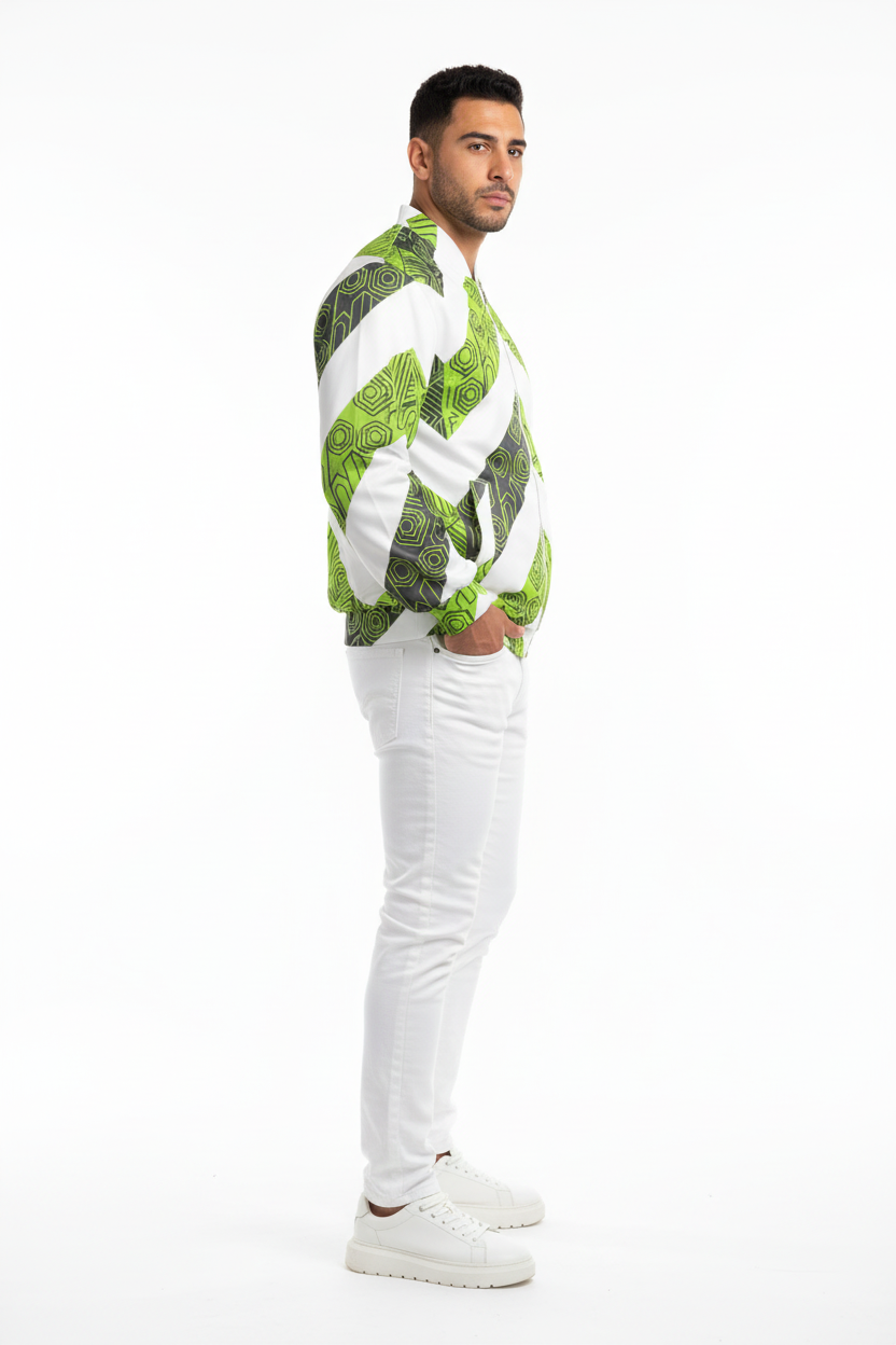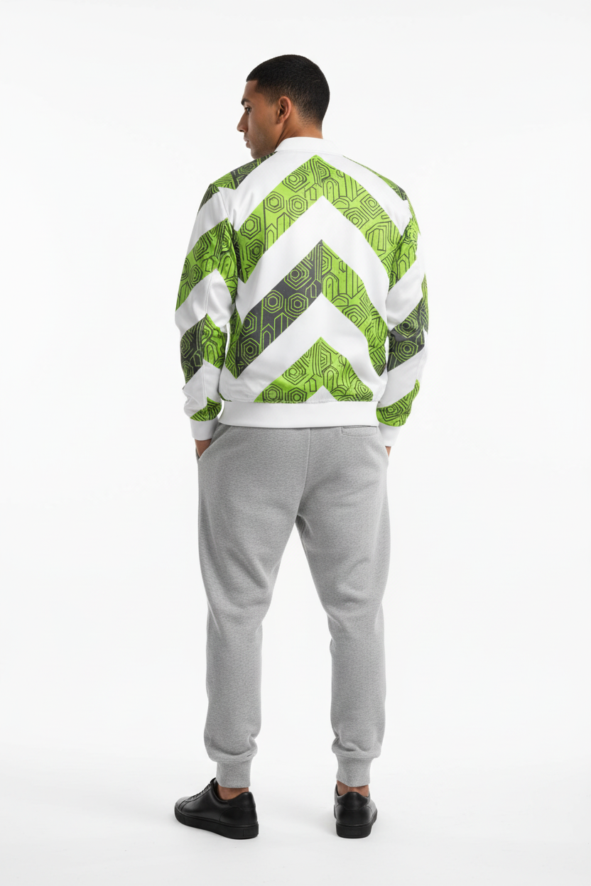 Elevate your streetwear game with this electrifying neon geo bomber jacket featuring bold electric green and white geometric patterns. Designed for those who command attention, this jacket brings futuristic energy and premium craftsmanship to your wardrobe.