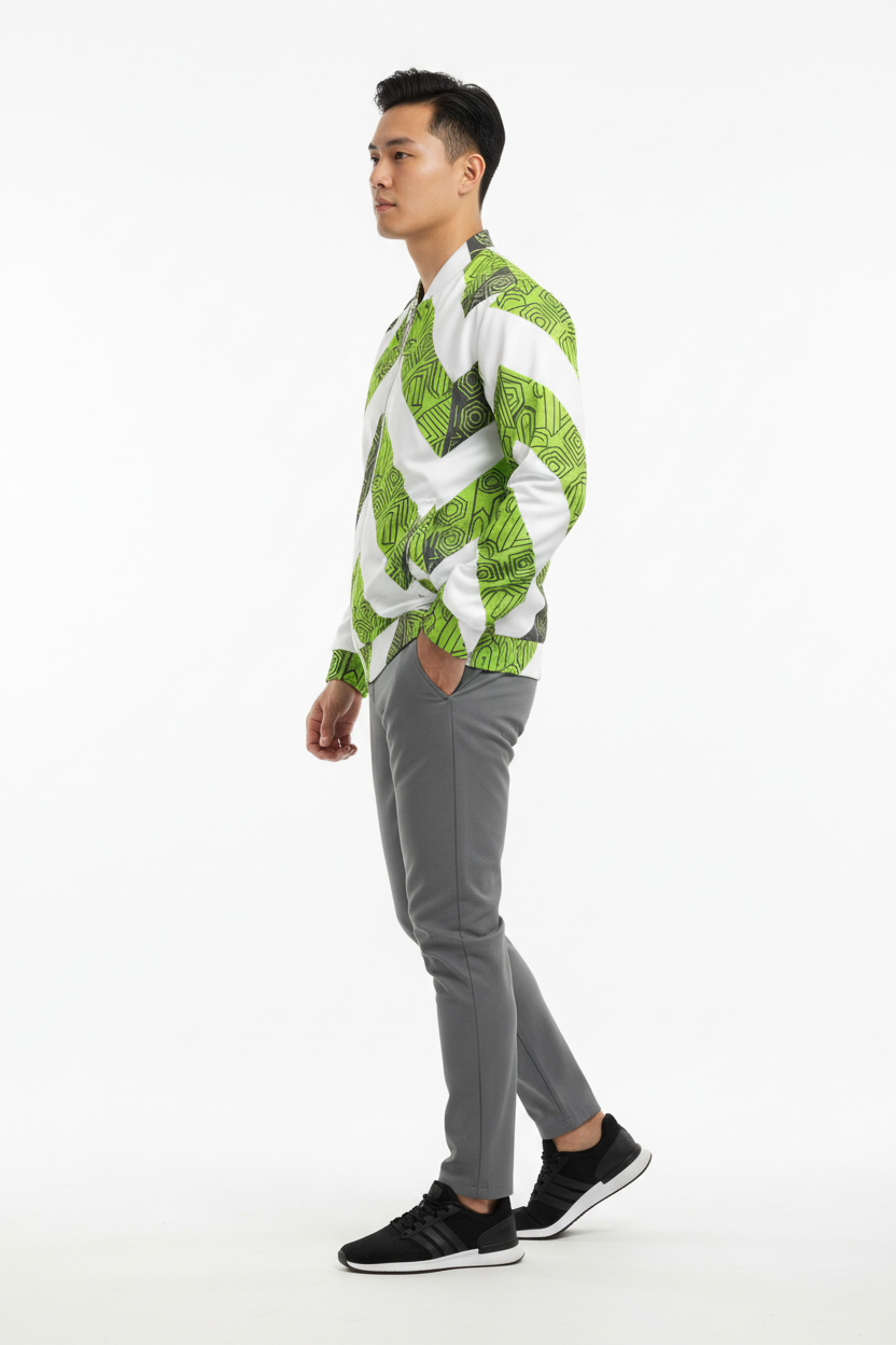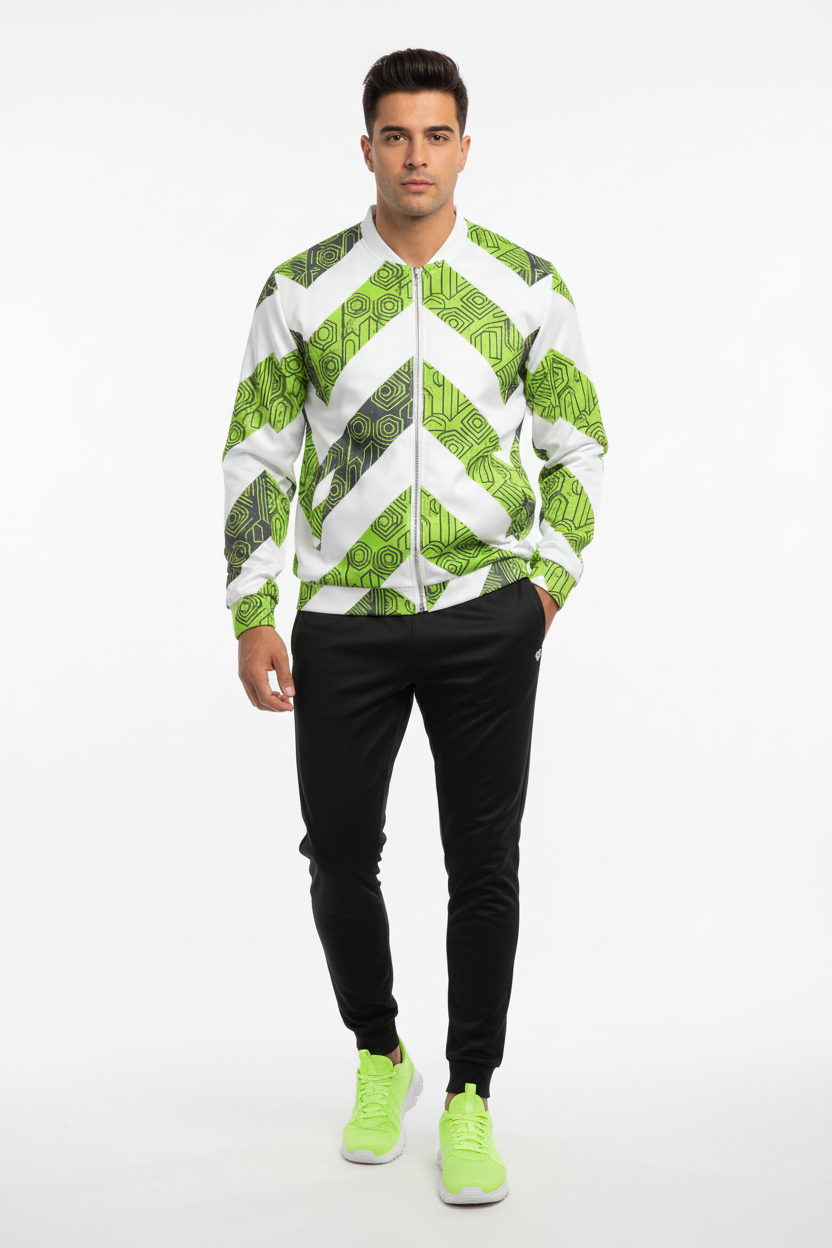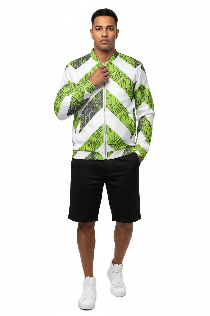 Whether you're hitting the streets, heading to a concert, or building your signature look, this bomber jacket delivers unmatched visual impact. The vibrant neon green geometric design creates dynamic movement, while the brushed fleece interior provides all-day comfort. The classic bomber silhouette with modern print makes this a versatile statement piece.