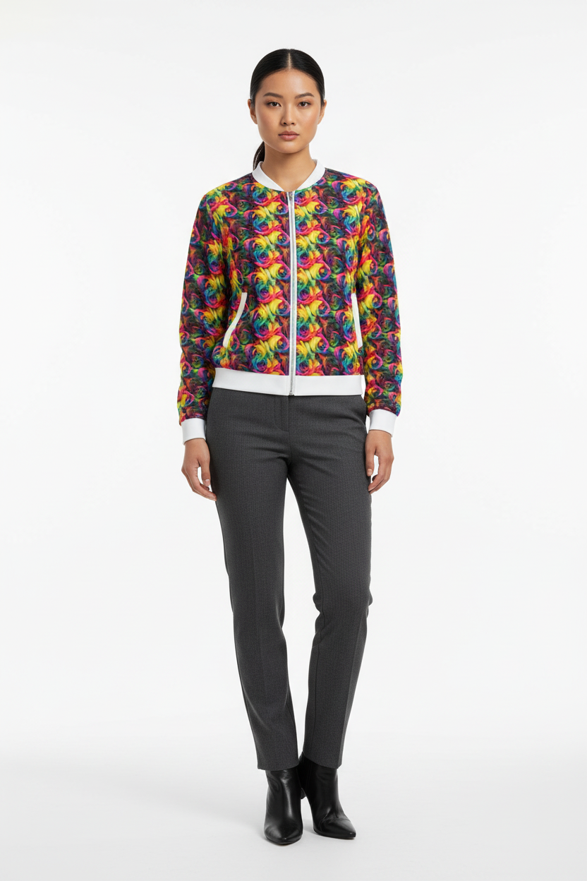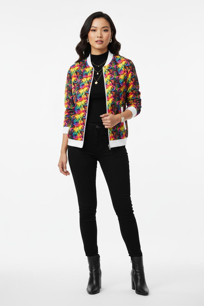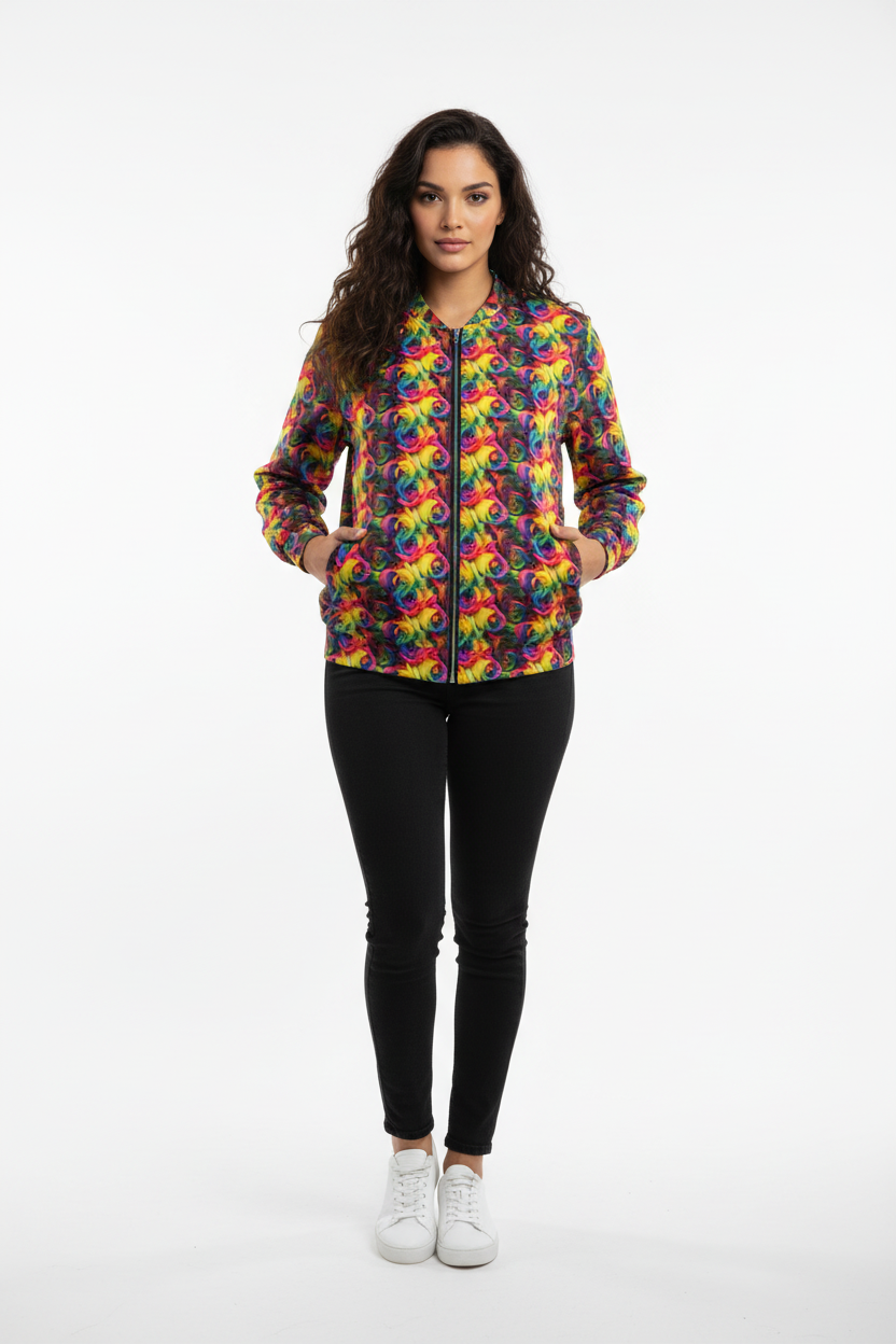 This bomber jacket is perfect for those who love to stand out. Layer over a basic tee and jeans for everyday wear, pair with leggings for athleisure vibes, or style over a dress for an unexpected twist. The vibrant rainbow rose print makes it a conversation starter while the classic bomber silhouette keeps it timeless and wearable.