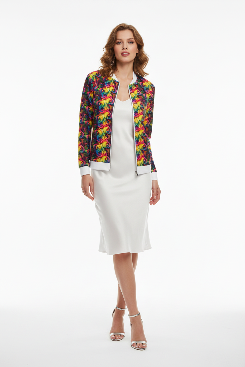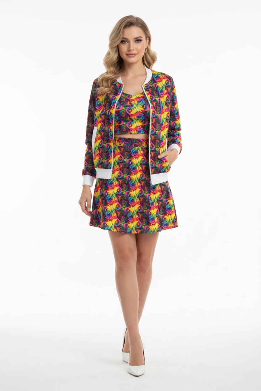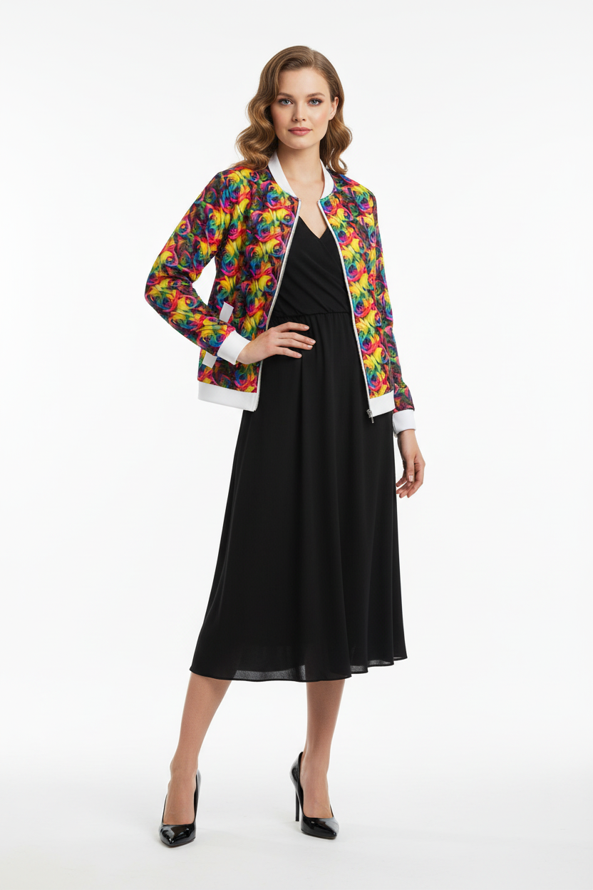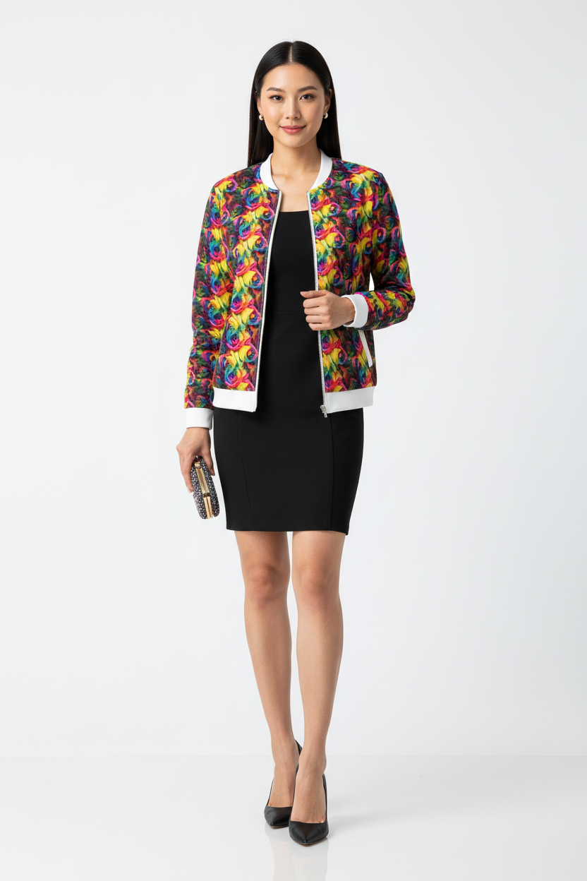This bomber jacket is perfect for those who love to stand out. Layer over a basic tee and jeans for everyday wear, pair with leggings for athleisure vibes, or style over a dress for an unexpected twist. The vibrant rainbow rose print makes it a conversation starter while the classic bomber silhouette keeps it timeless and wearable.