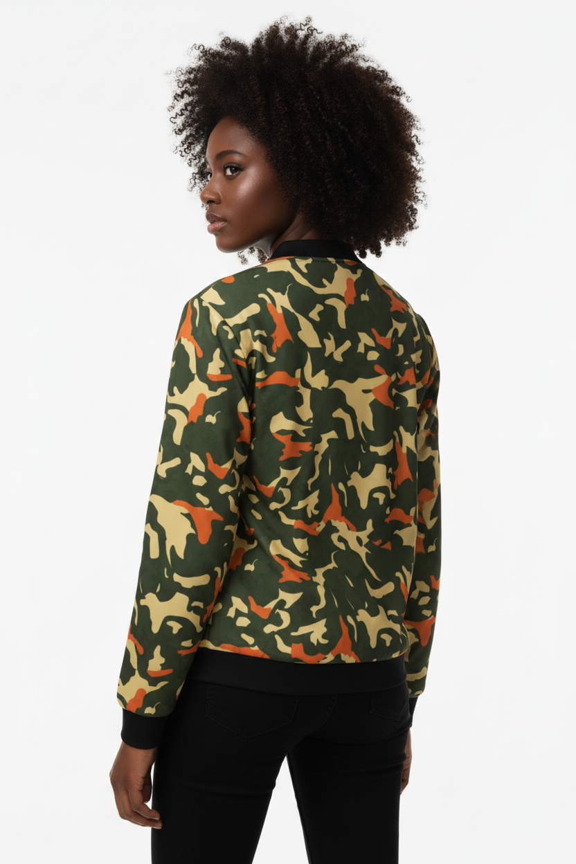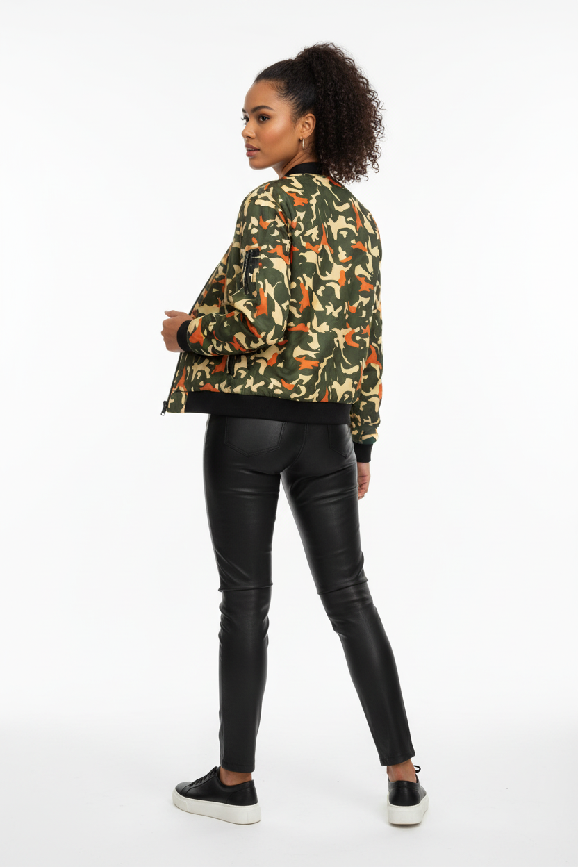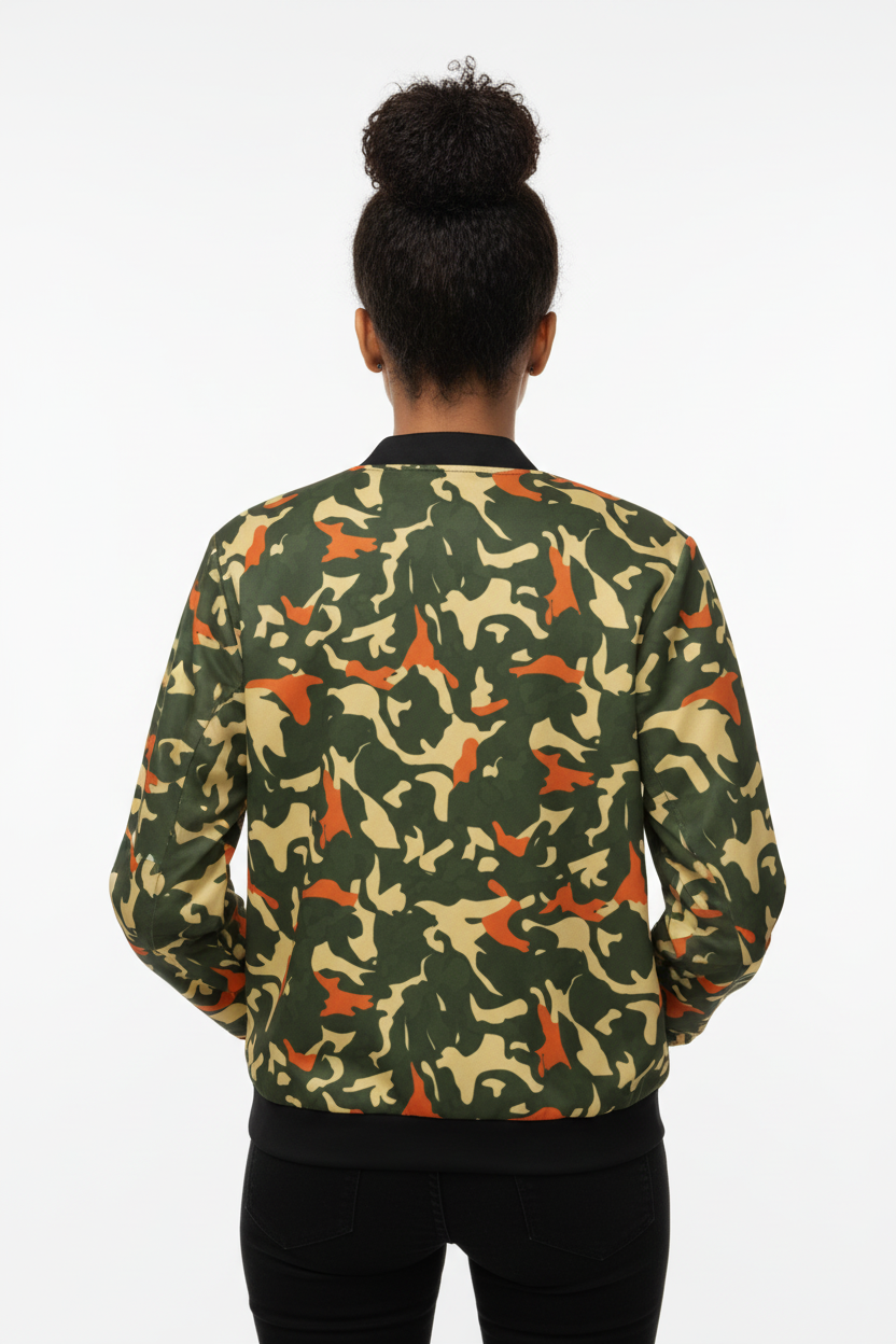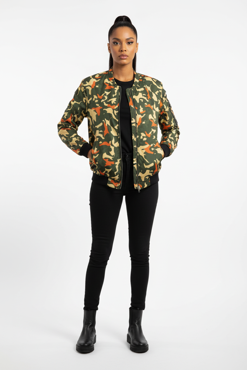 Make a bold statement with this eye-catching bomber jacket featuring a vibrant orange and green camouflage print. This modern twist on classic camo brings urban edge to your wardrobe with its unique color palette. The brushed fleece interior and relaxed unisex fit make it as comfortable as it is stylish.