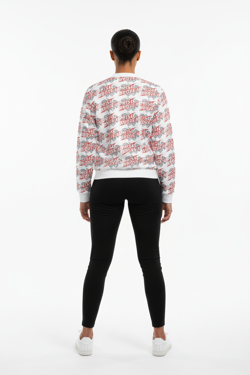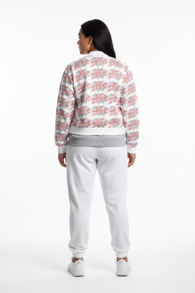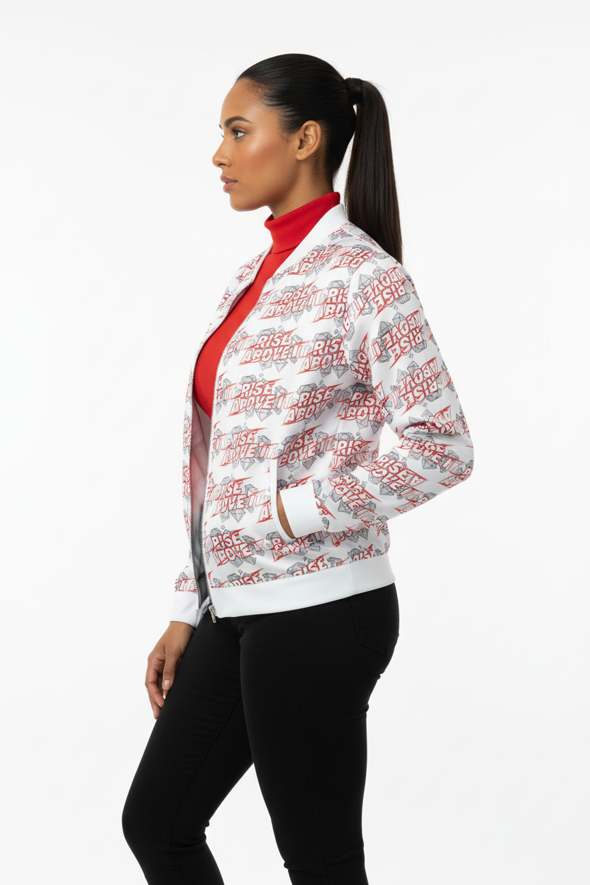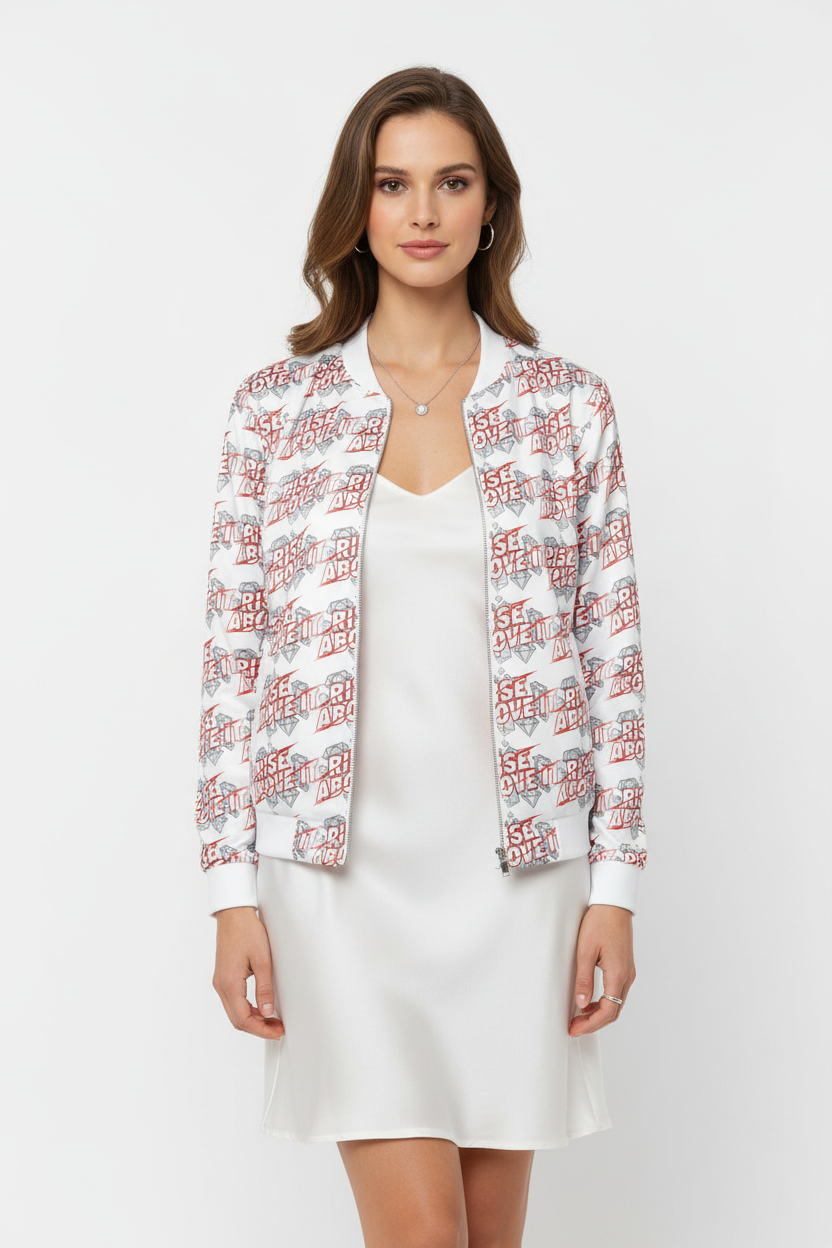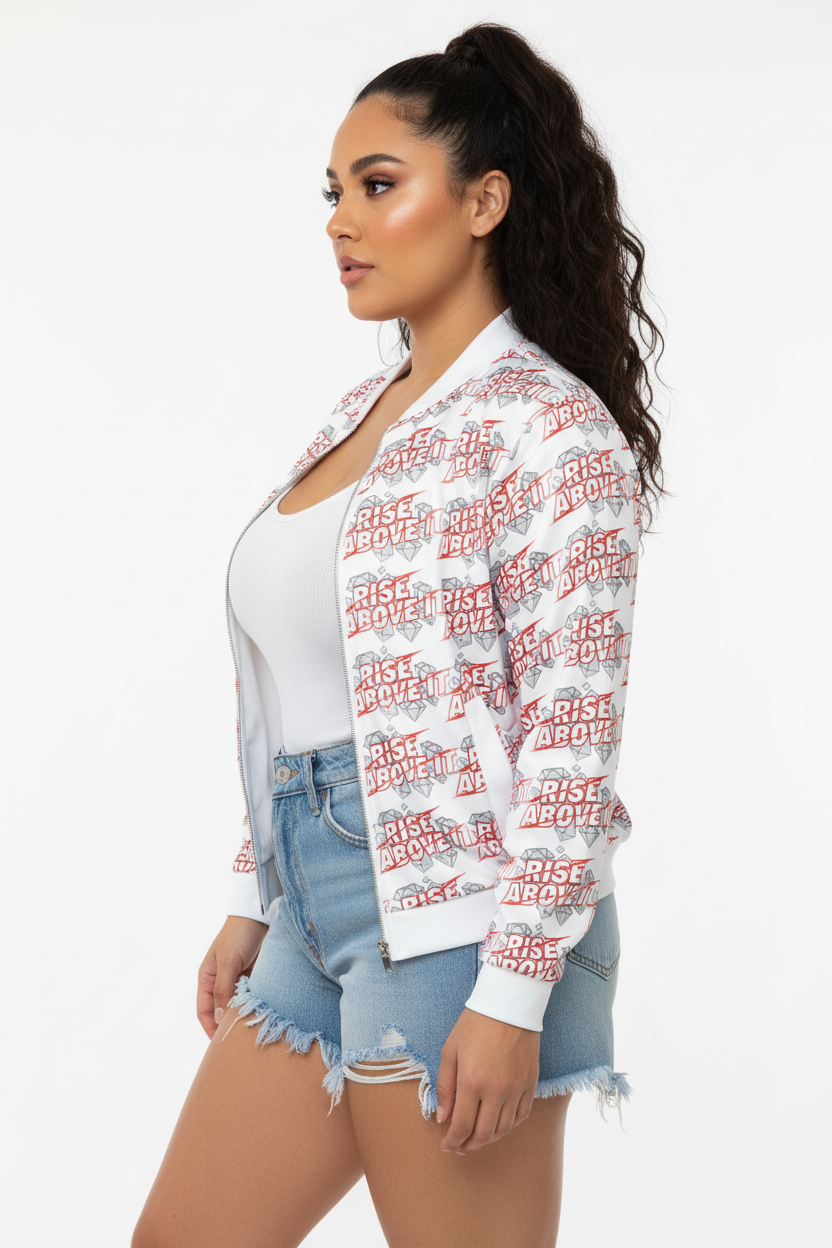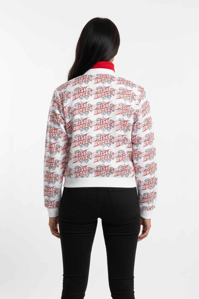 Make a powerful statement with the Rise Above It All-Over Print Bomber Jacket. Featuring bold red typography and diamond graphics in a dynamic repeating pattern, this motivational bomber combines street style edge with empowering energy.