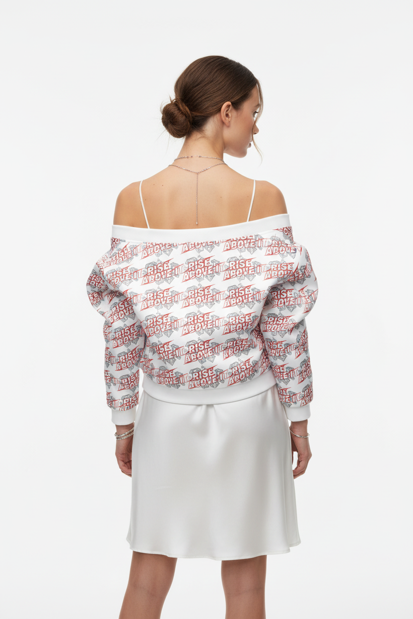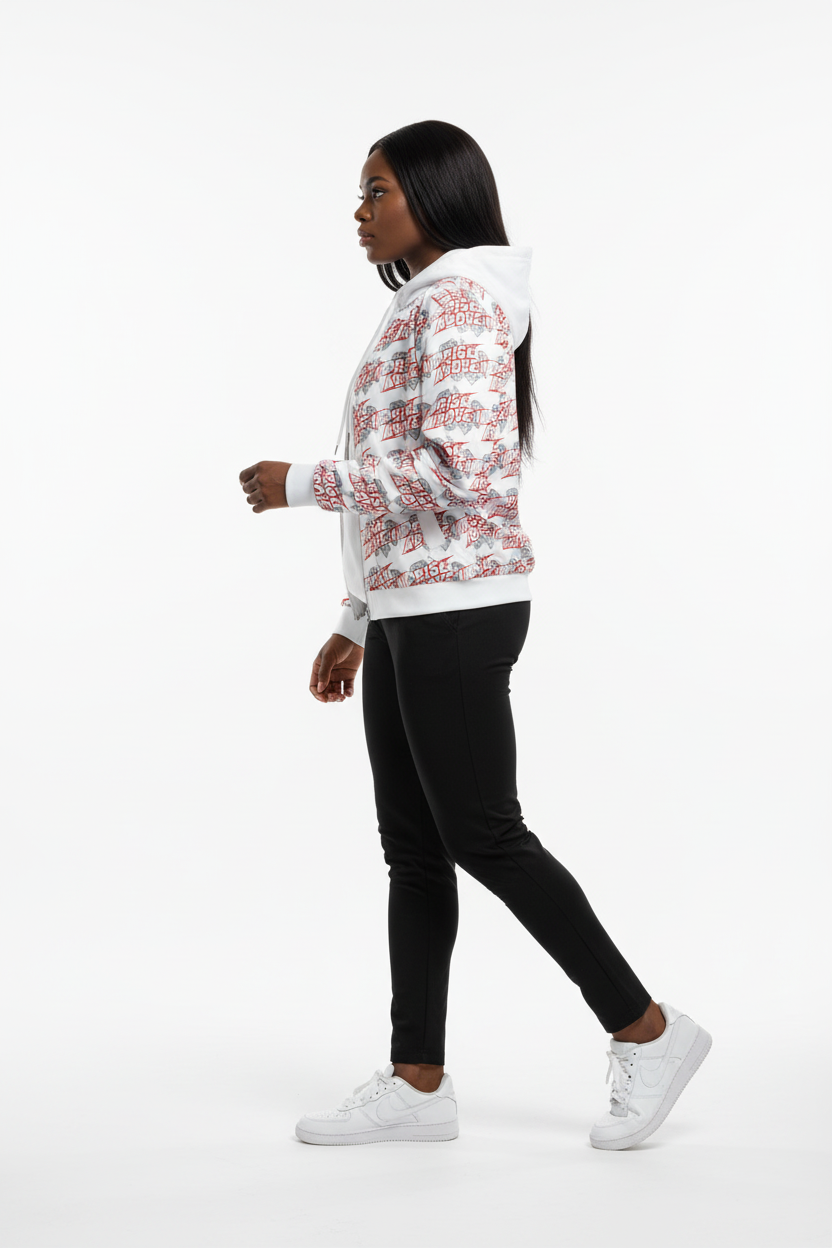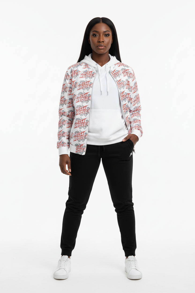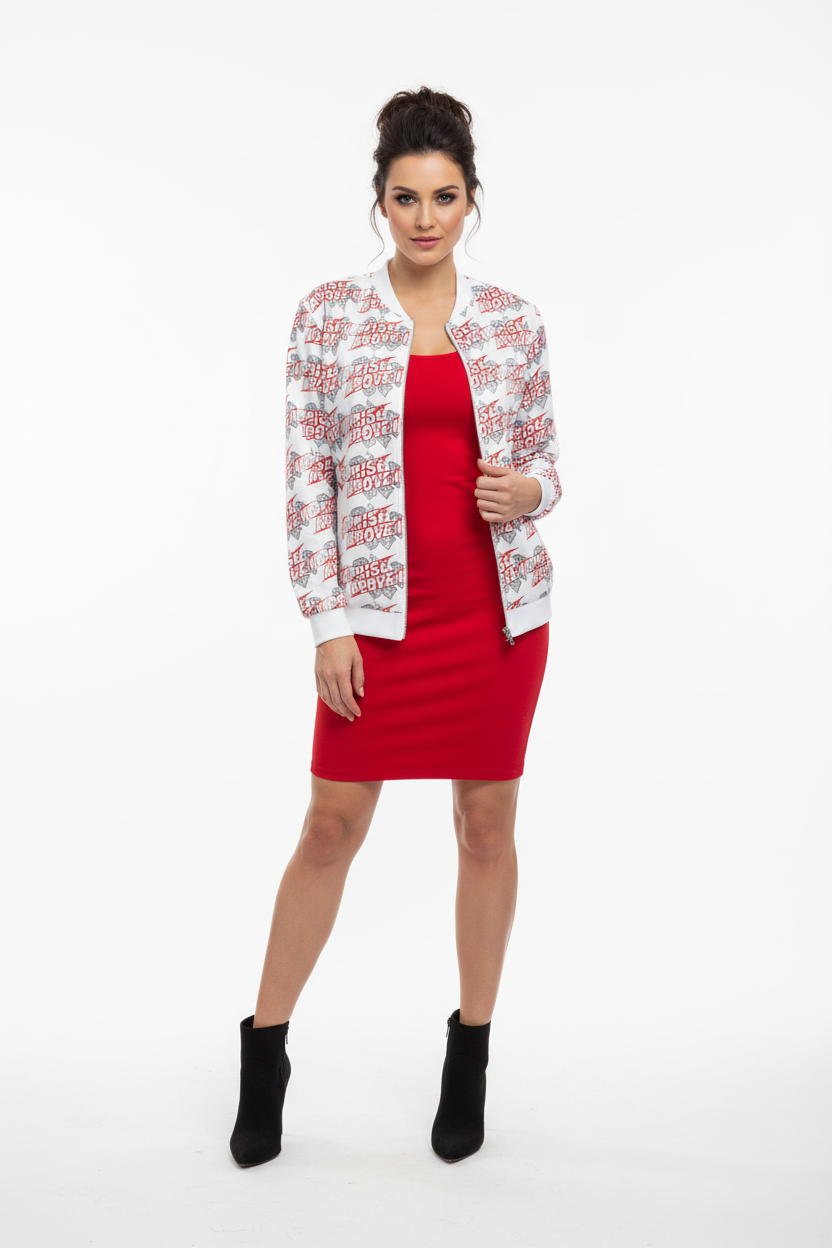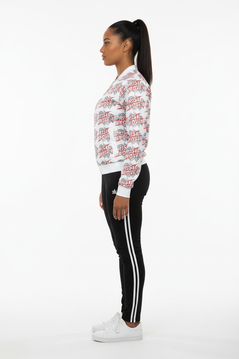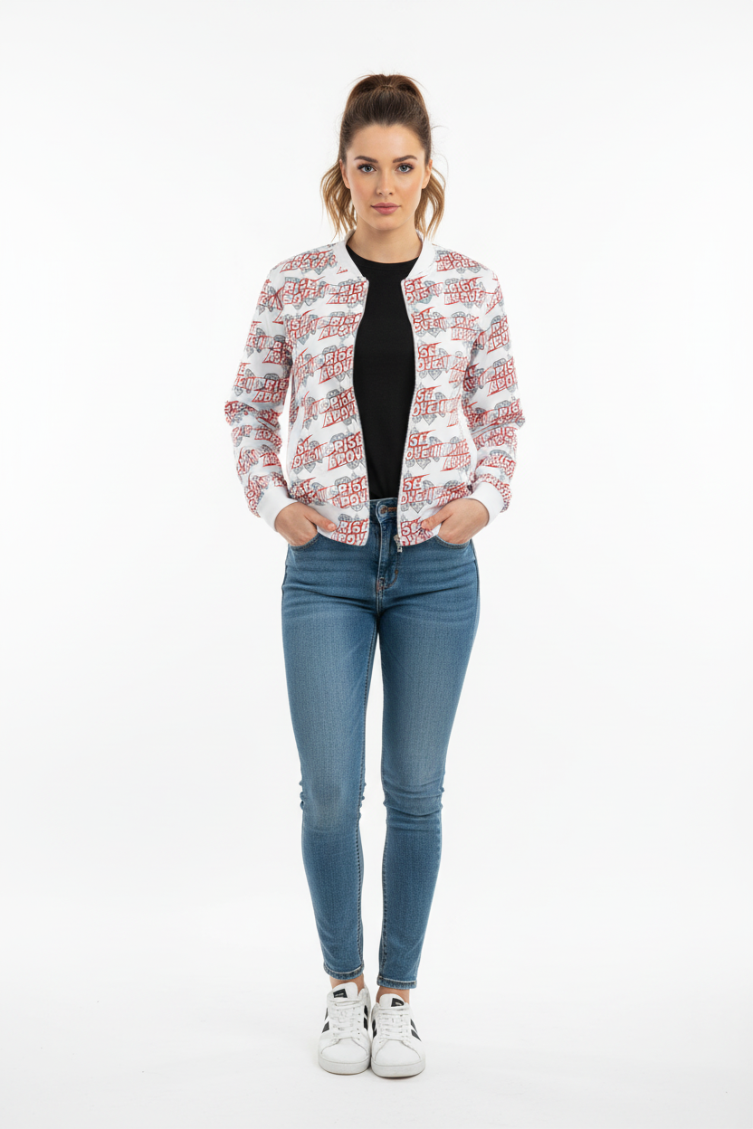 Make a powerful statement with the Rise Above It All-Over Print Bomber Jacket. Featuring bold red typography and diamond graphics in a dynamic repeating pattern, this motivational bomber combines street style edge with empowering energy.