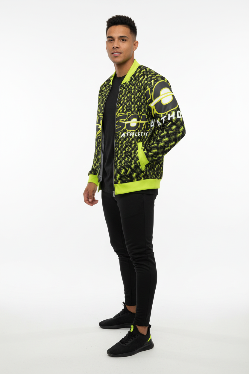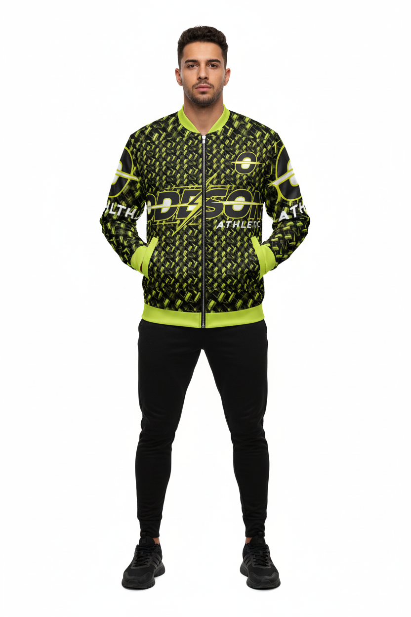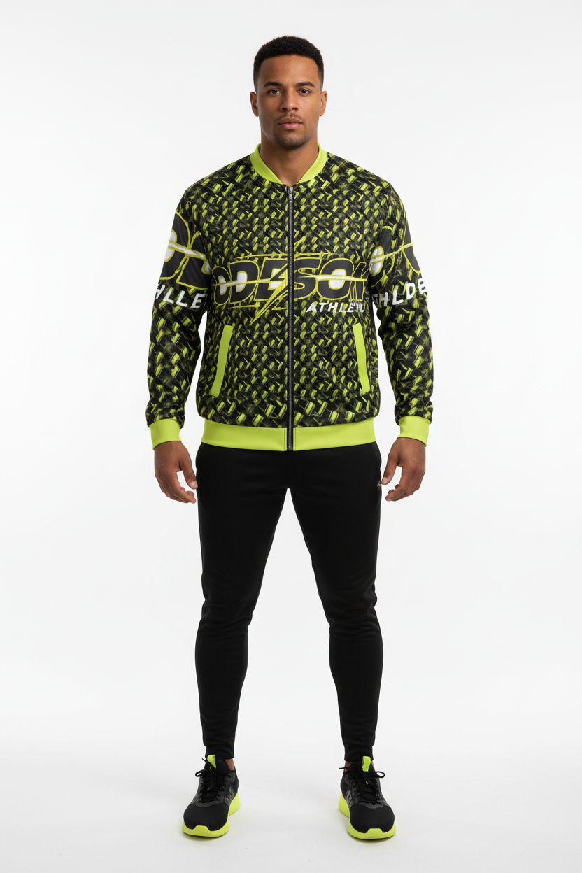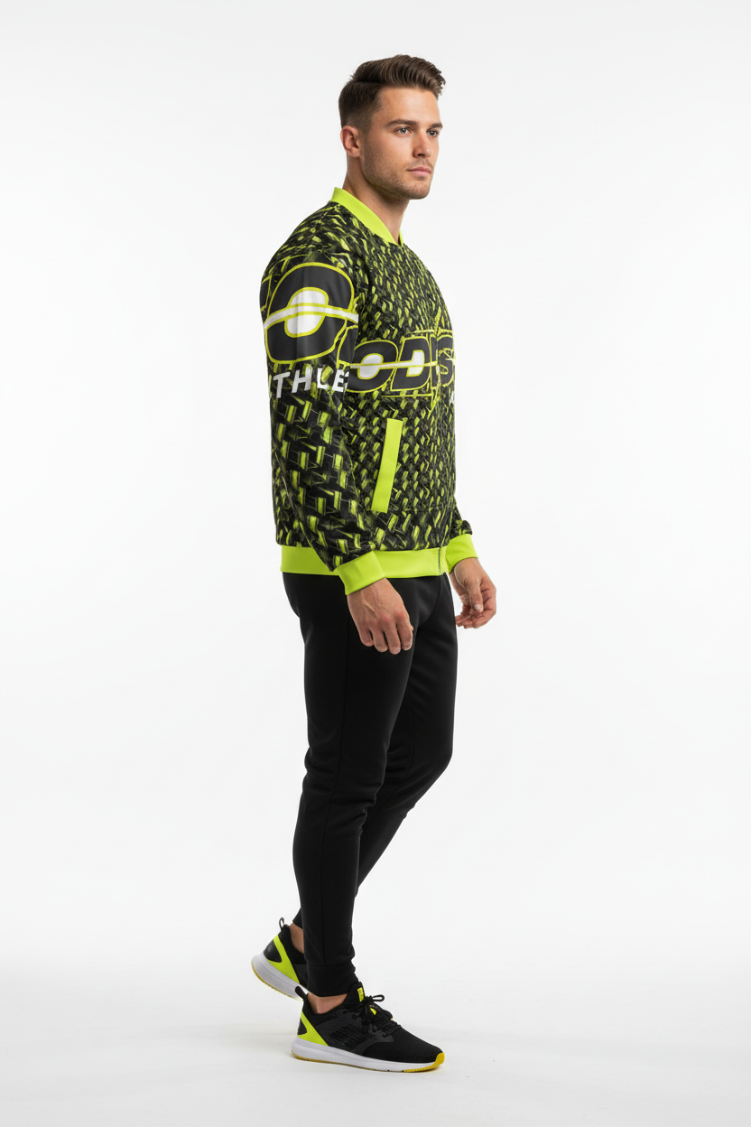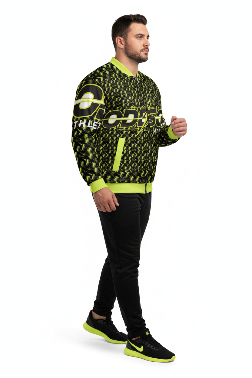 Make an unforgettable entrance with the ODDSON Athletic All-Over Print Bomber Jacket—a bold statement piece that fuses high-energy graphics with premium athletic style. Featuring an electrifying neon yellow and black geometric pattern that wraps the entire jacket, this design delivers maximum visual impact from every angle.