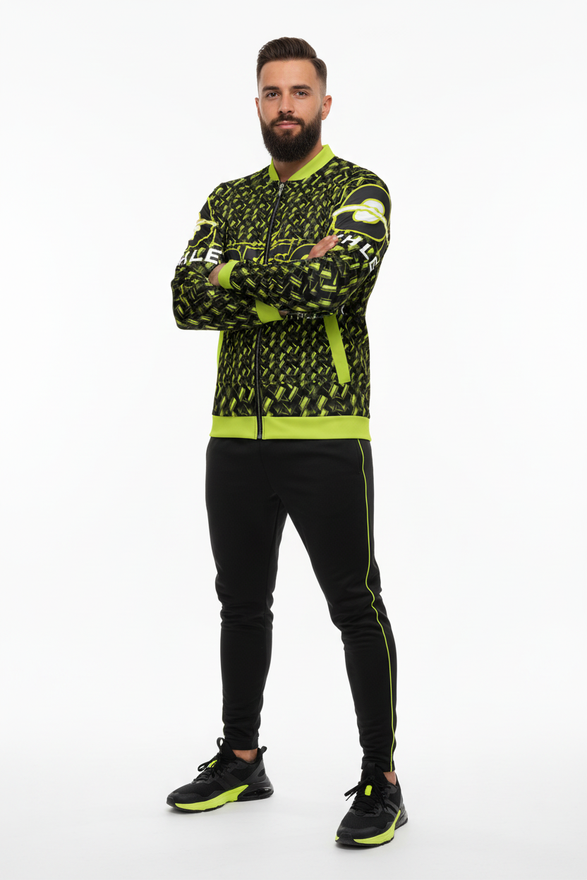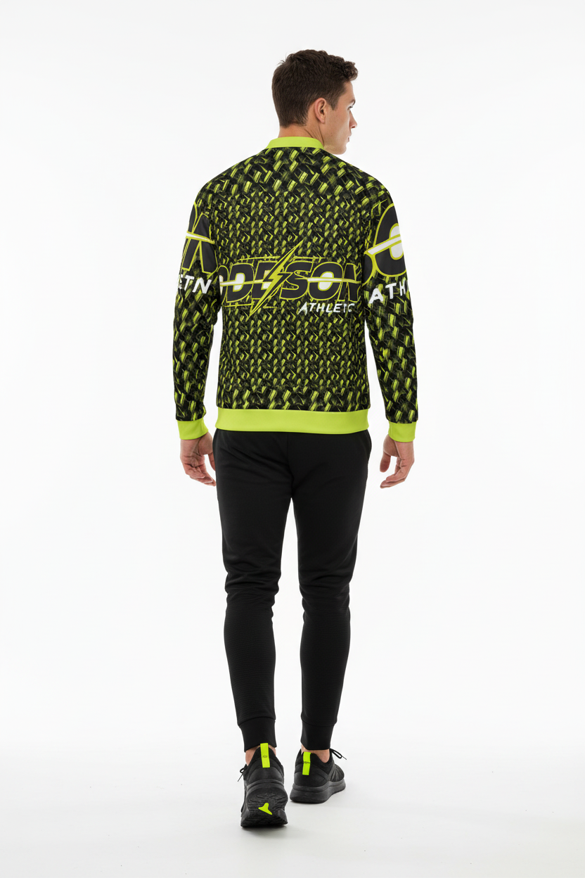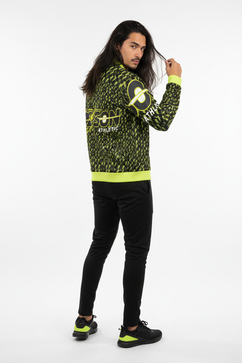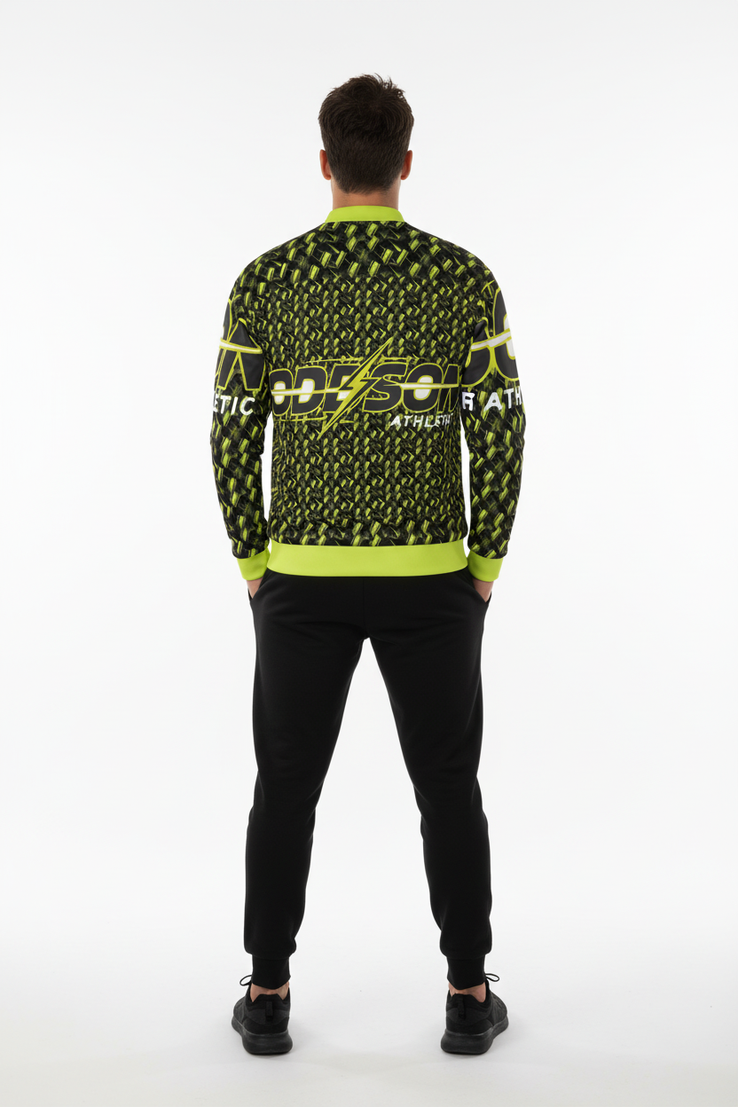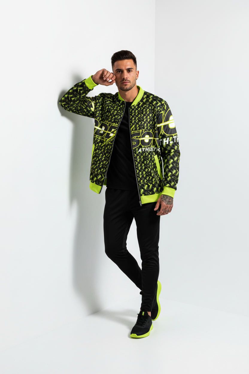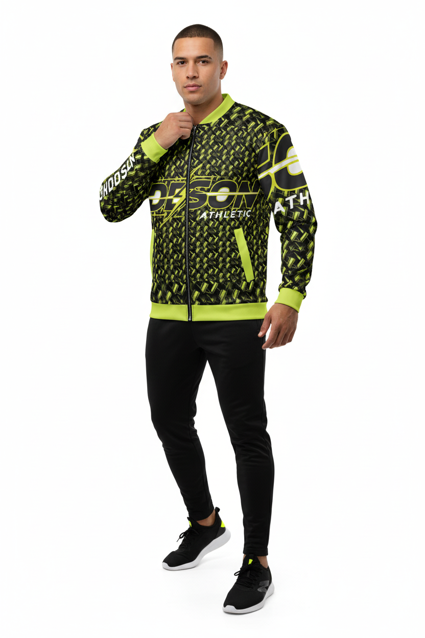 Make an unforgettable entrance with the ODDSON Athletic All-Over Print Bomber Jacket—a bold statement piece that fuses high-energy graphics with premium athletic style. Featuring an electrifying neon yellow and black geometric pattern that wraps the entire jacket, this design delivers maximum visual impact from every angle.