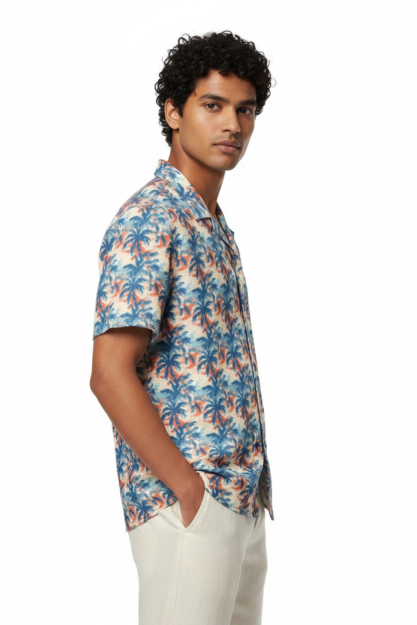 Meet your new favorite summer shirt! This unisex button-up features a stunning watercolor palm tree print in dreamy blue, coral, and cream tones that capture the essence of tropical sunsets. The lightweight, moisture-wicking fabric keeps you cool and comfortable all day long.