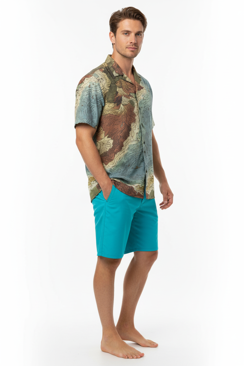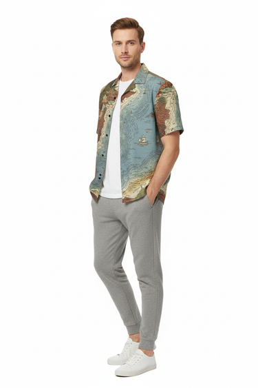 Navigate in style with this vintage-inspired nautical map shirt. Featuring an authentic topographic ocean map pattern in muted blues, browns, and creams with sailing ships and coastal details, this button-up brings maritime heritage to modern casual wear.