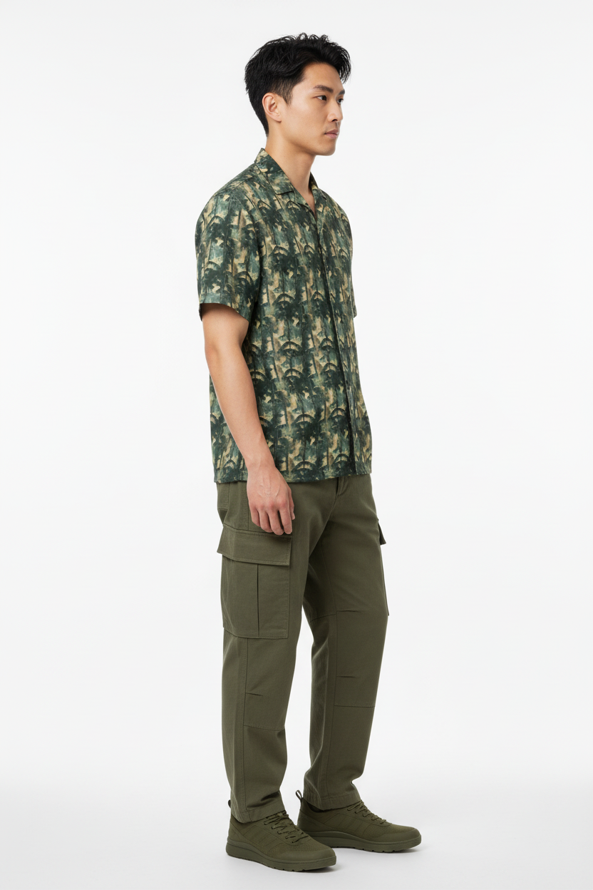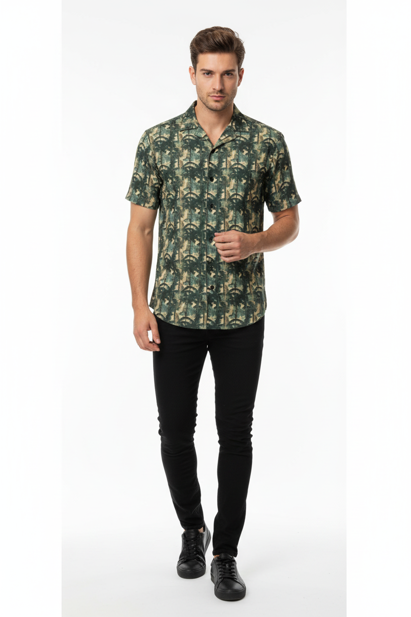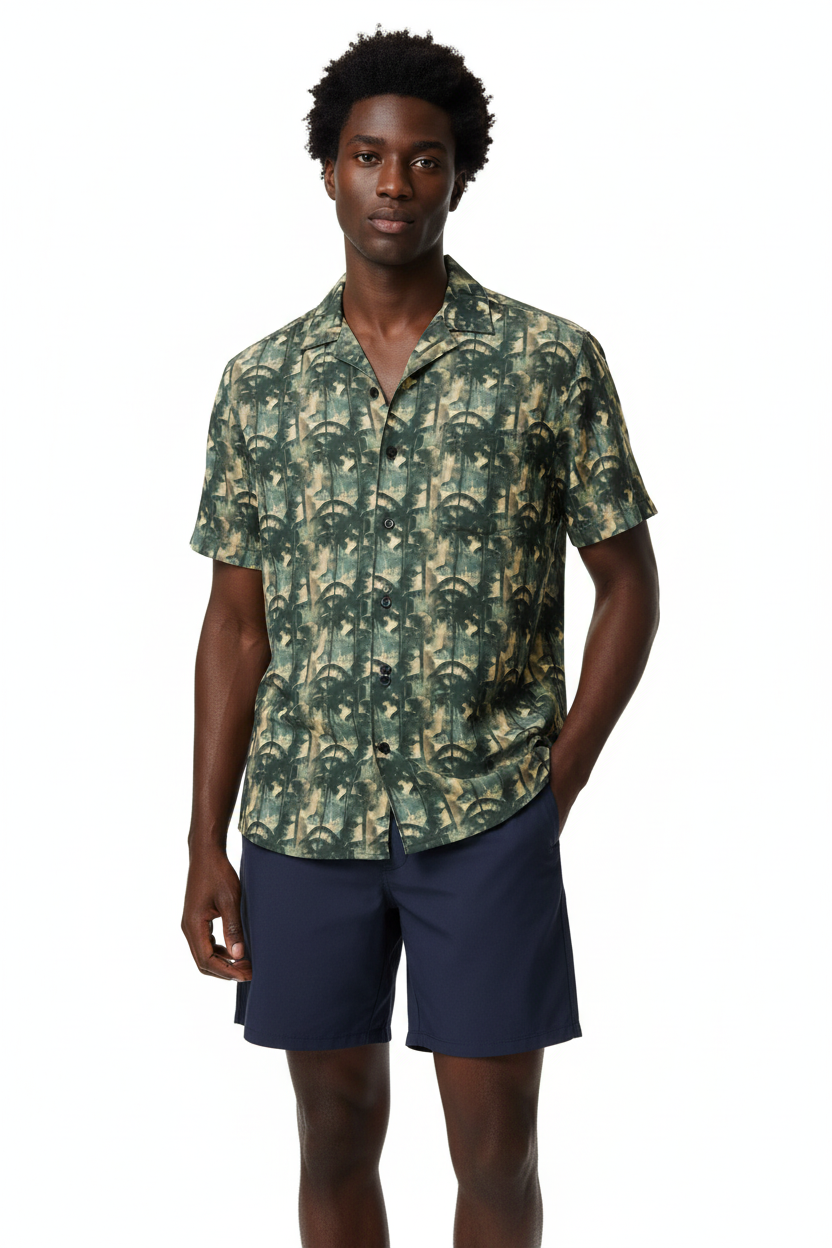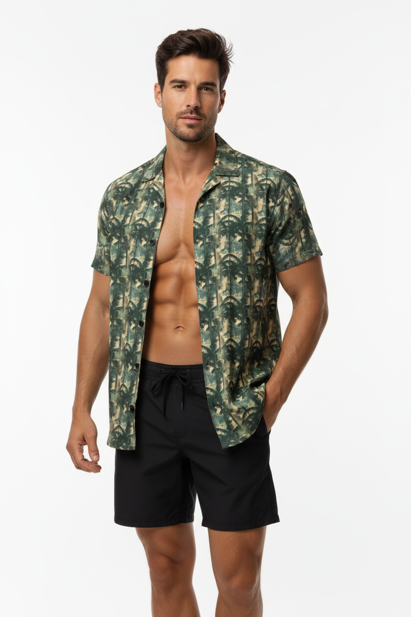 The Bamboo Forest Camo Button Shirt brings a unique twist to classic camouflage with an artistic bamboo forest pattern. Featuring layered green, tan, and black tones that create a dimensional woodland effect, this lightweight button-up combines tactical style with resort comfort for a look that stands out from standard camo.