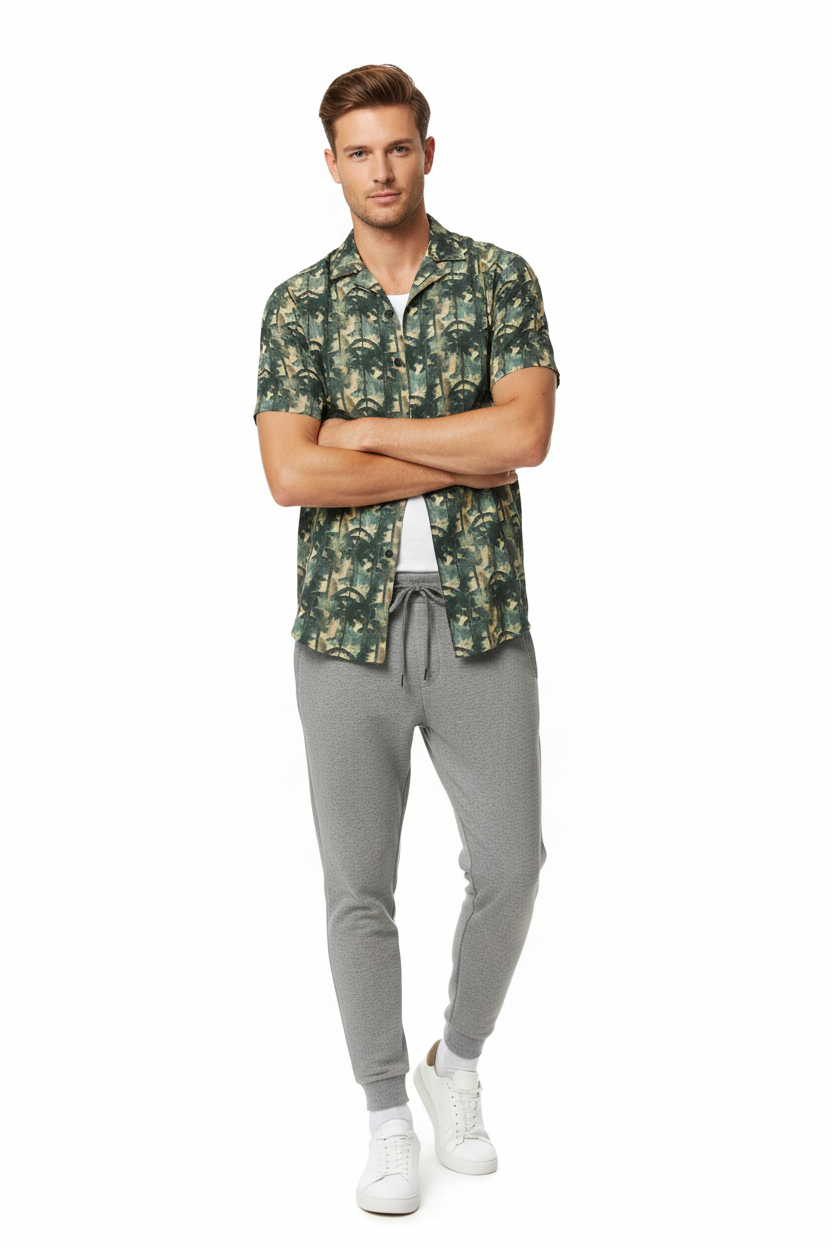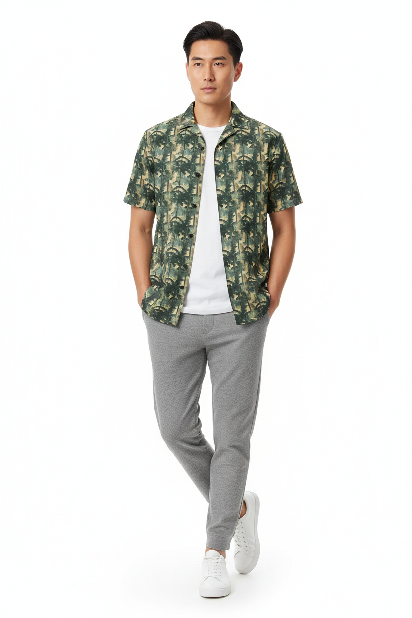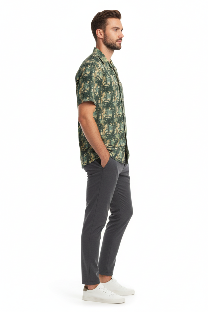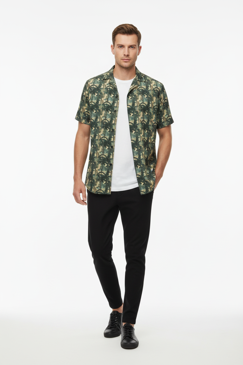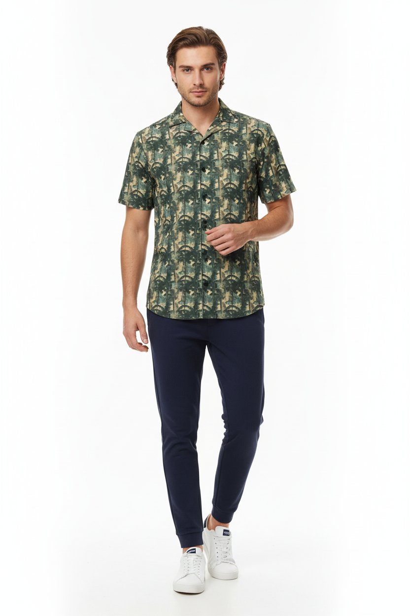The Bamboo Forest Camo Button Shirt brings a unique twist to classic camouflage with an artistic bamboo forest pattern. Featuring layered green, tan, and black tones that create a dimensional woodland effect, this lightweight button-up combines tactical style with resort comfort for a look that stands out from standard camo.