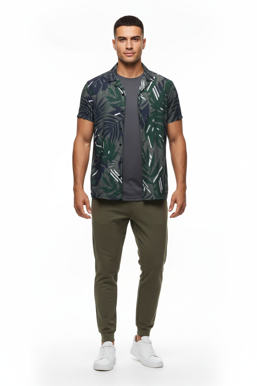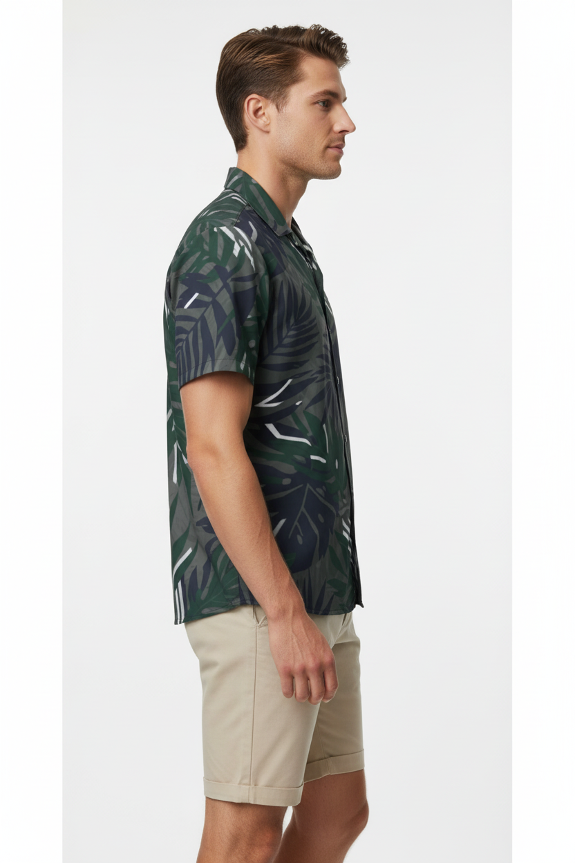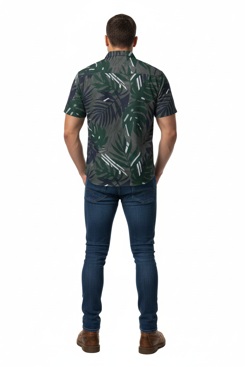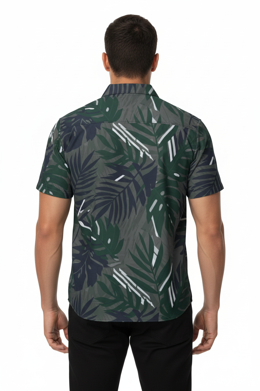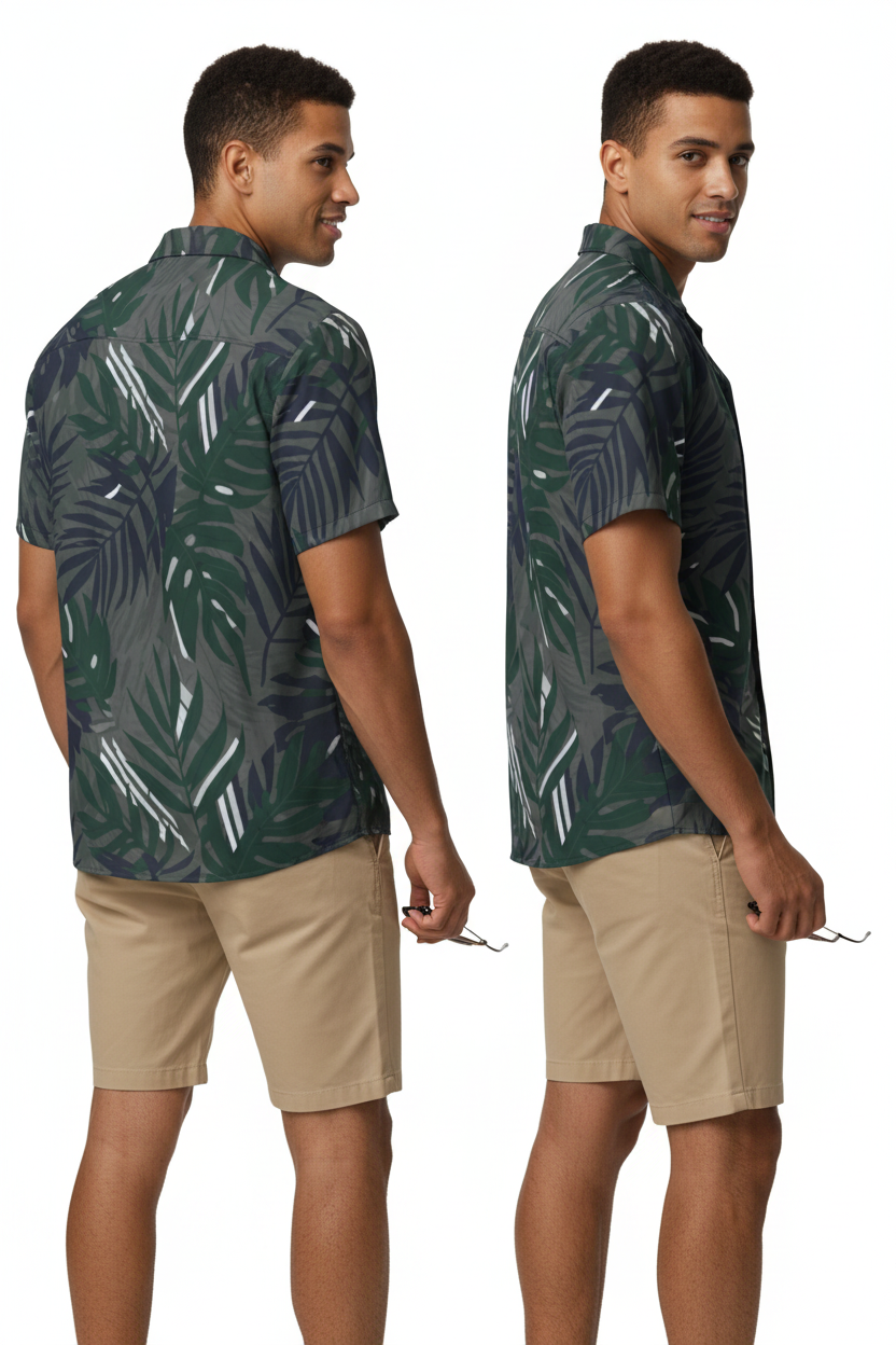 Embrace island vibes with this Tropical Palm Leaf Button-Up Shirt, featuring a sophisticated dark green and navy palm frond pattern that brings vacation-ready style to your wardrobe. This lightweight, breathable shirt combines resort-inspired design with premium performance fabric, making it perfect for warm-weather adventures and casual occasions.