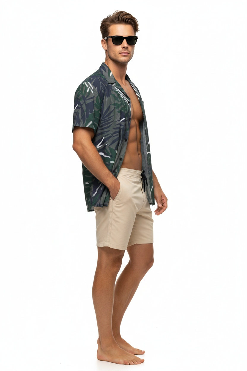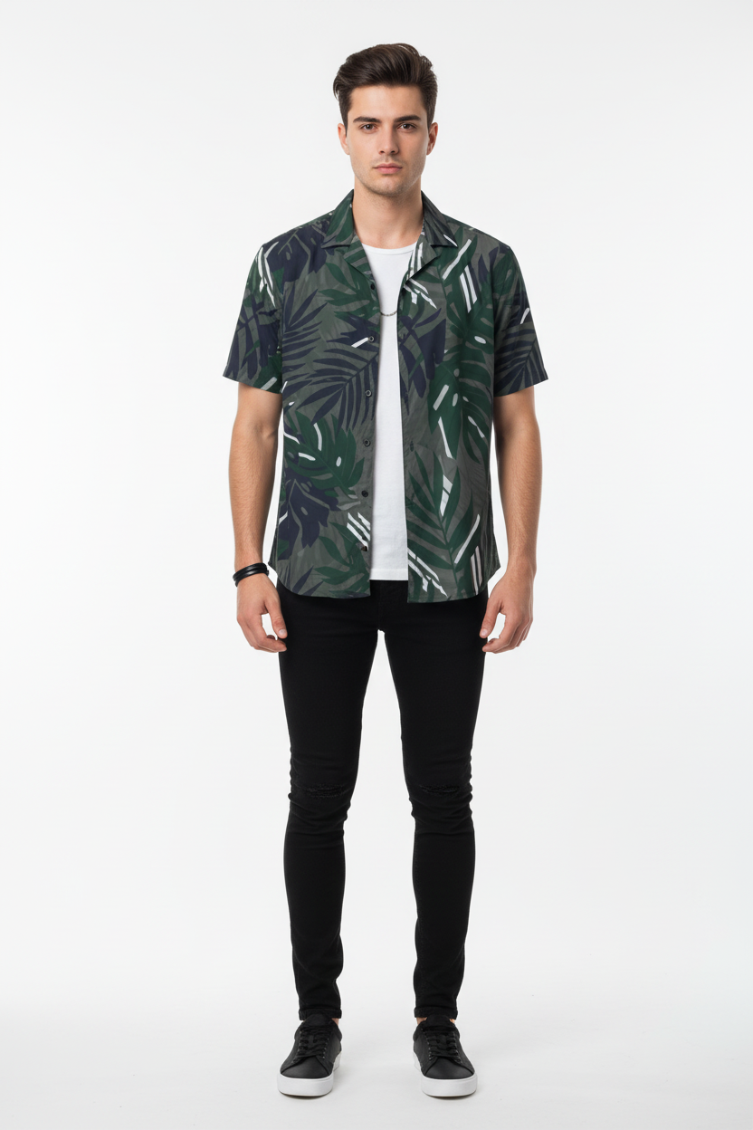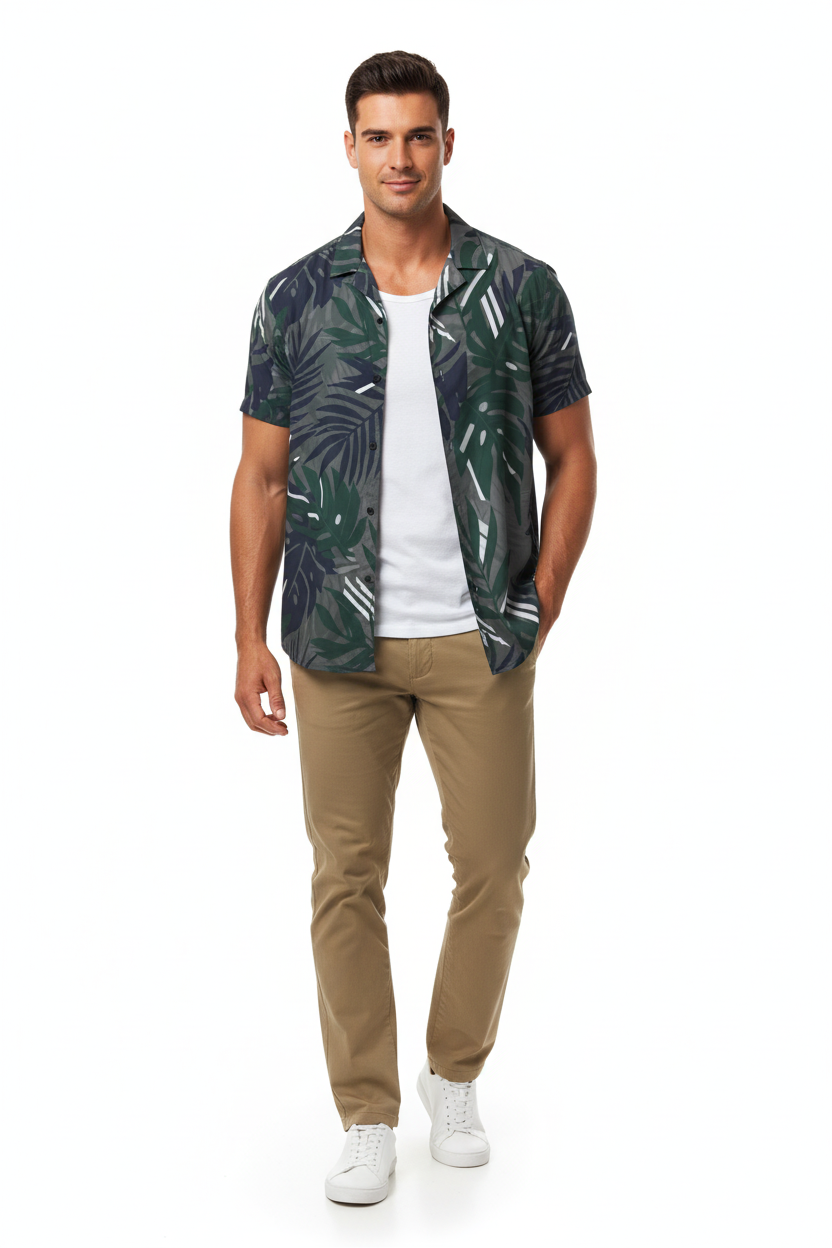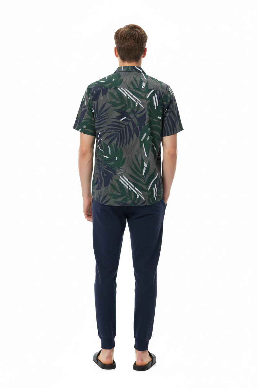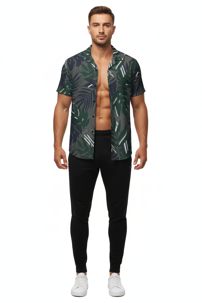 Embrace island vibes with this Tropical Palm Leaf Button-Up Shirt, featuring a sophisticated dark green and navy palm frond pattern that brings vacation-ready style to your wardrobe. This lightweight, breathable shirt combines resort-inspired design with premium performance fabric, making it perfect for warm-weather adventures and casual occasions.