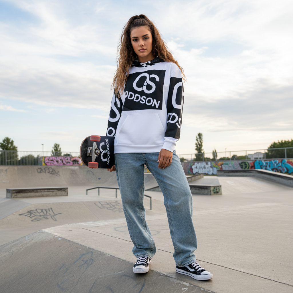 - Black & White Colorblocking: High-contrast sleeves with repeating ODDSON text add dynamic visual interest