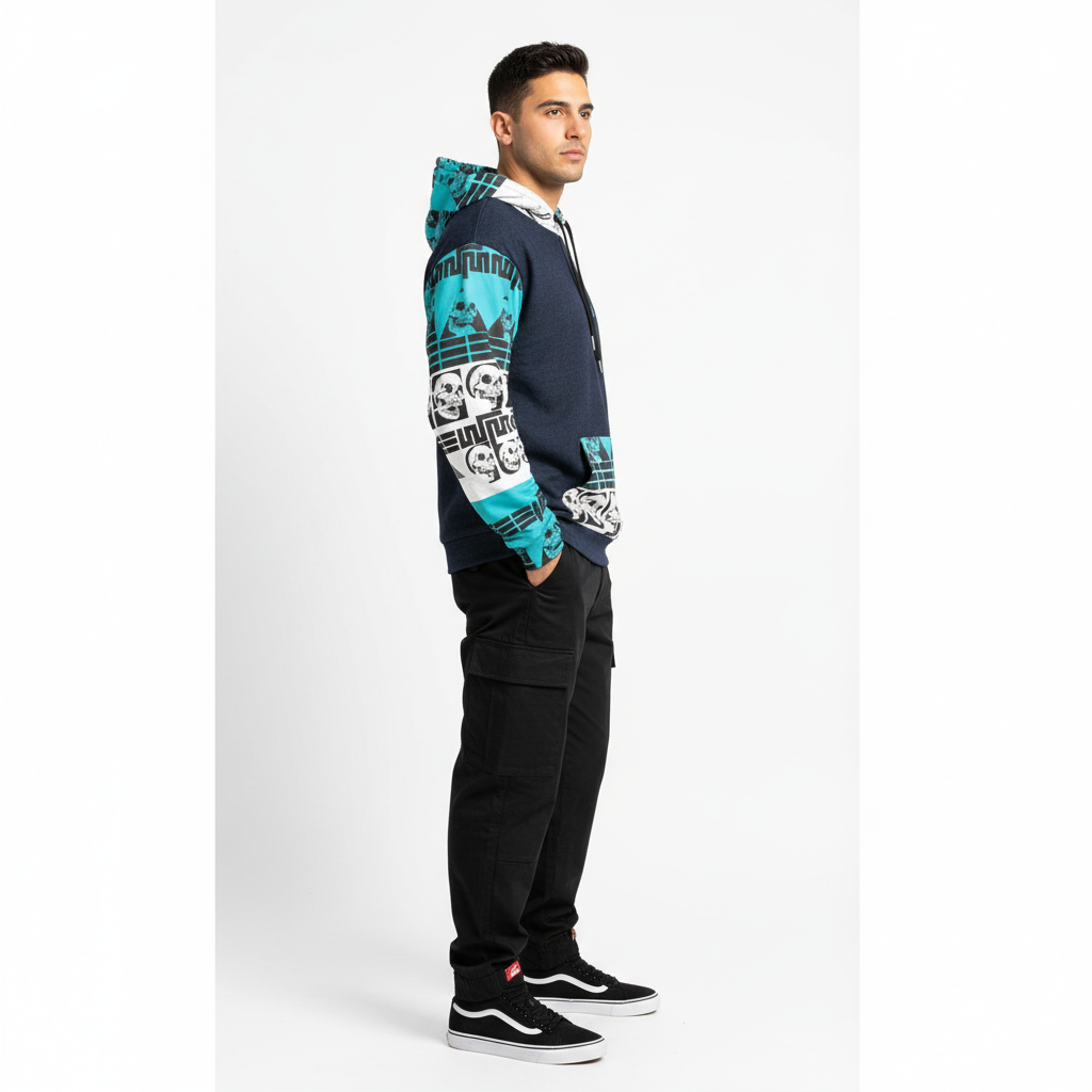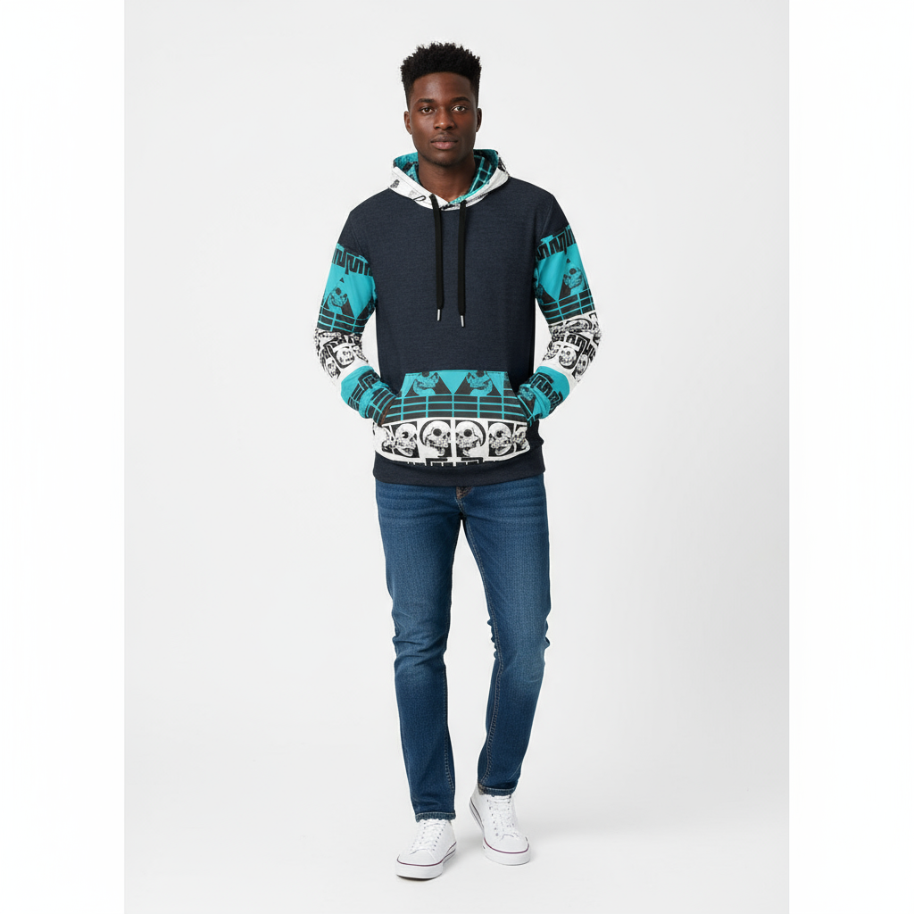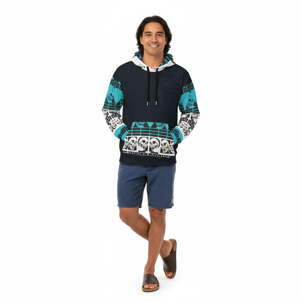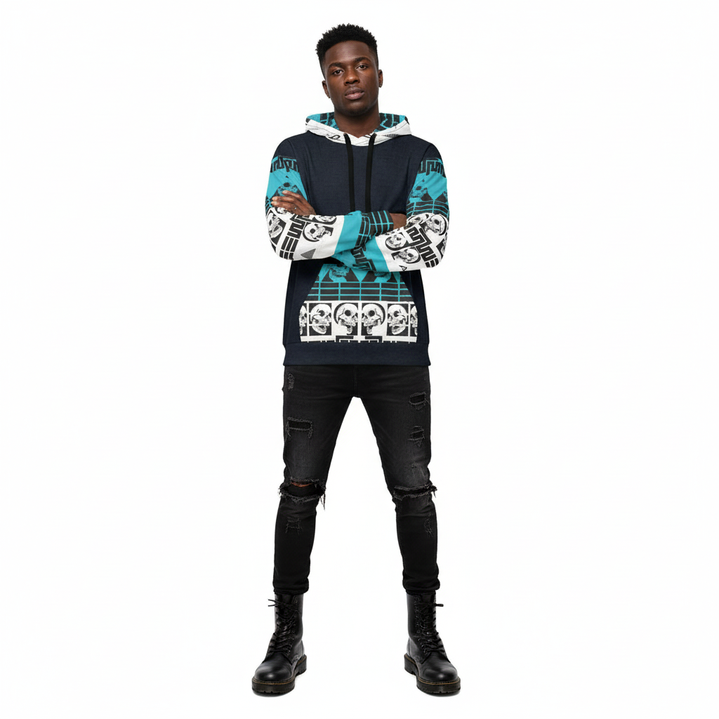 The Life Query Hoodie makes a powerful statement with its striking navy blue, turquoise, and white skull graphic print. Featuring geometric patterns, bold typography, and thought-provoking imagery, this all-over print hoodie is designed for those who embrace individuality and aren't afraid to stand out from the crowd.
