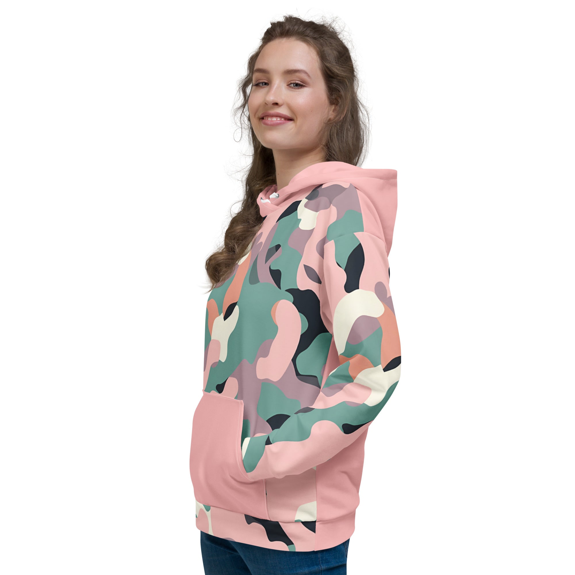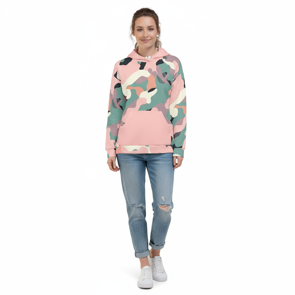 Make a bold statement with the Alppeer's Camou Hoodie – where sustainable fashion meets eye-catching style. Featuring a distinctive pink and teal camo print with a solid pink hood and kangaroo pocket, this eco-friendly hoodie is crafted from recycled materials and designed to turn heads wherever you go.