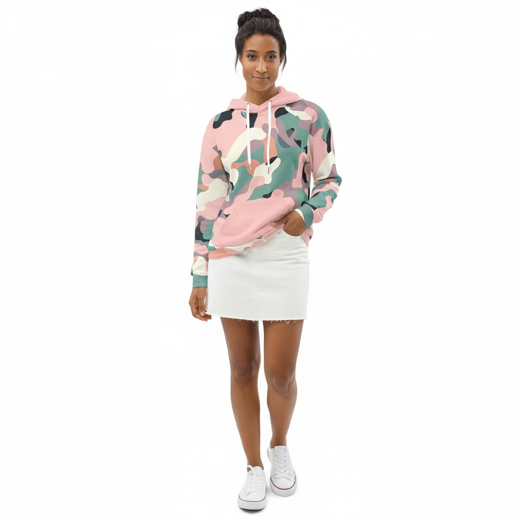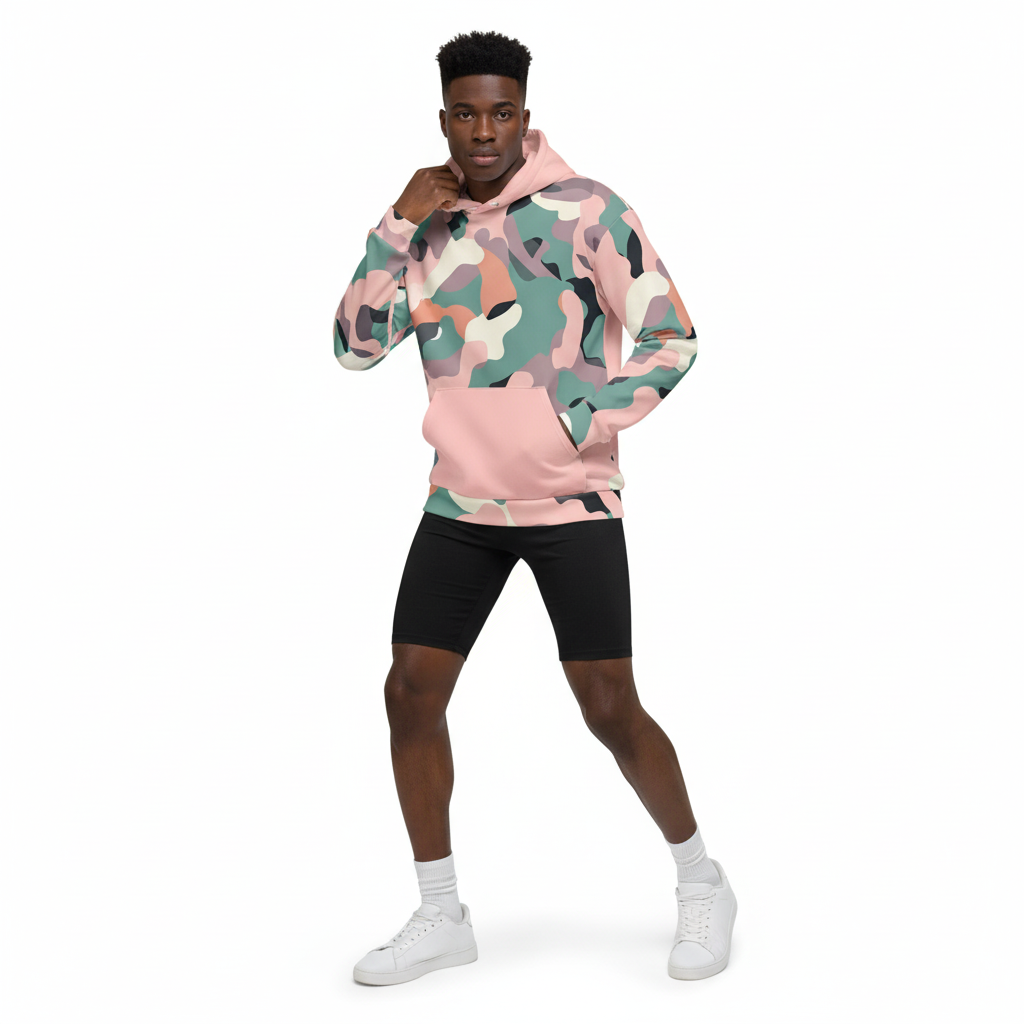 Style with black joggers and white sneakers for urban edge. The pink and teal camo creates a statement look that stands out in any crowd. Ideal for concerts, city exploring, or hanging with friends.
