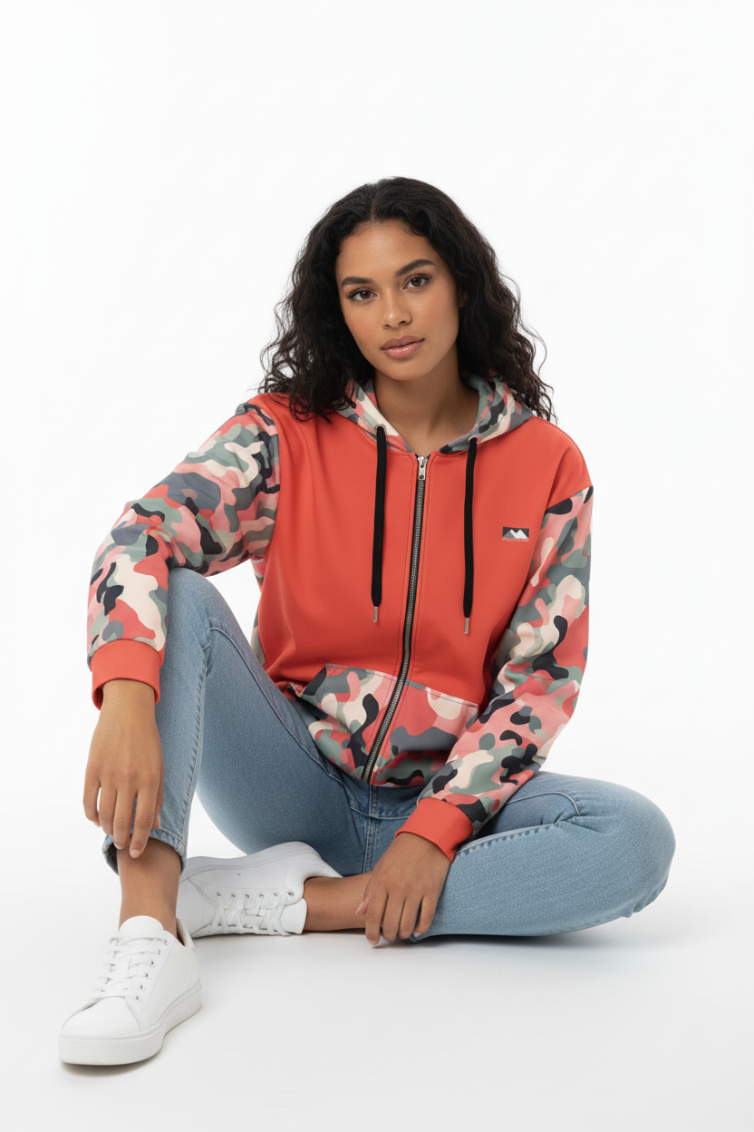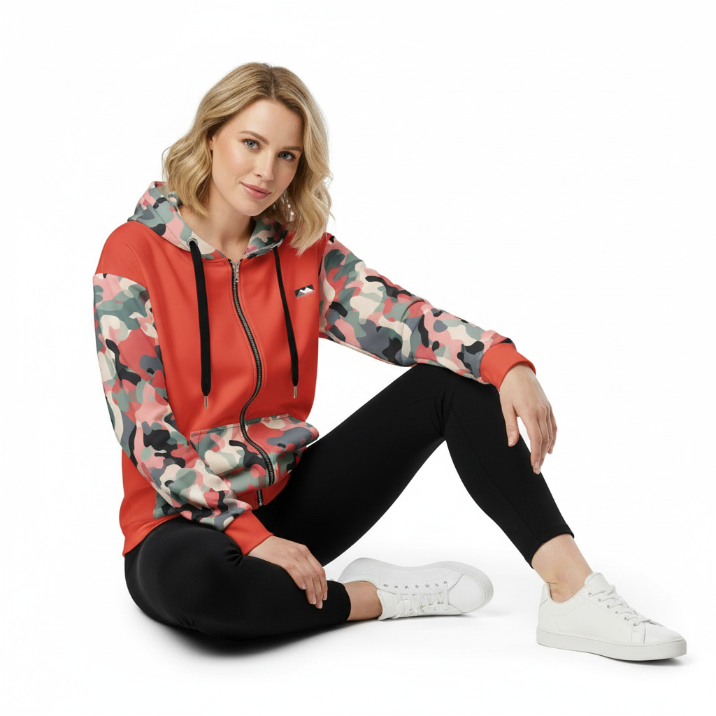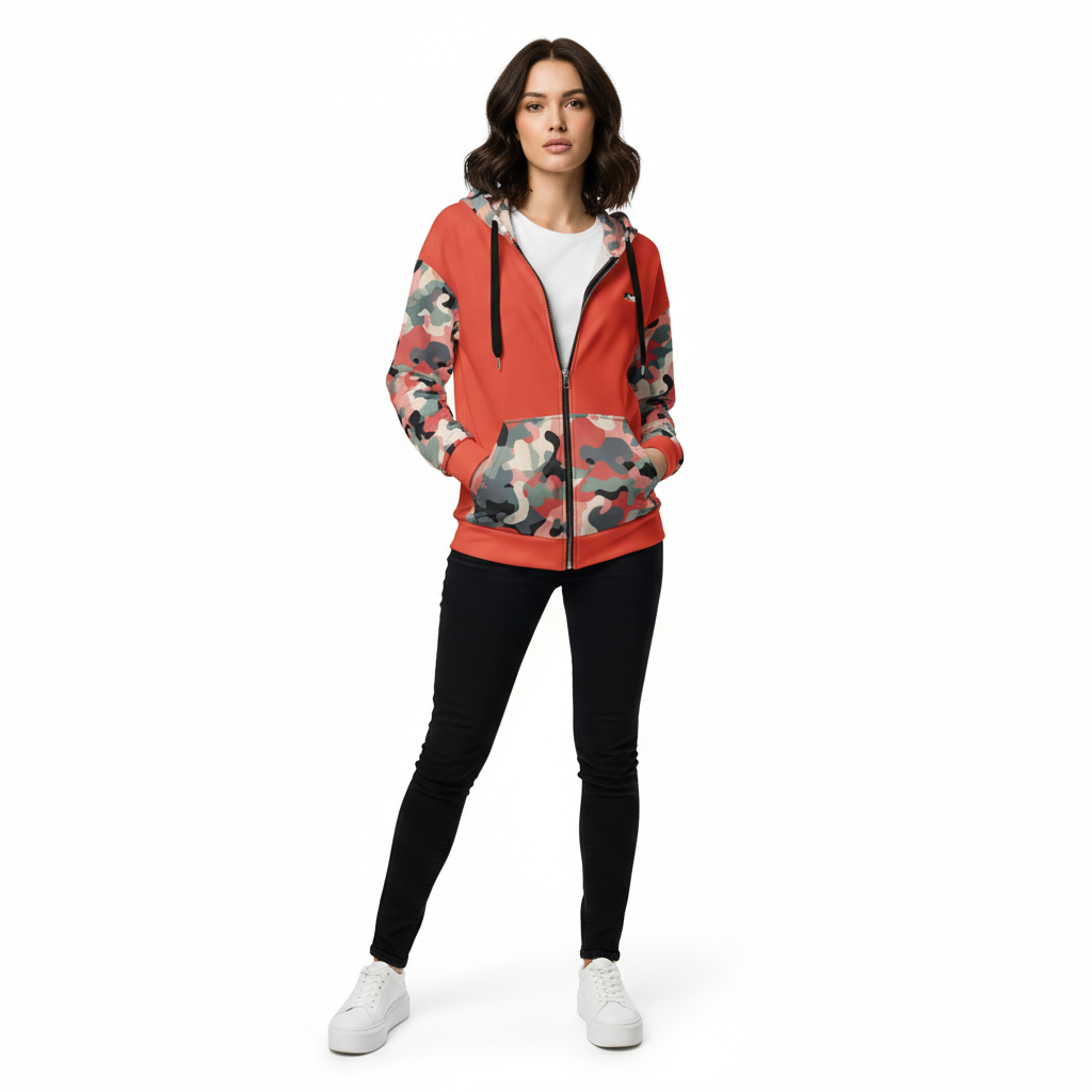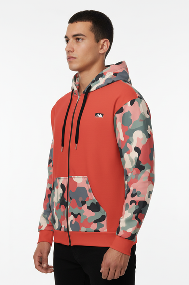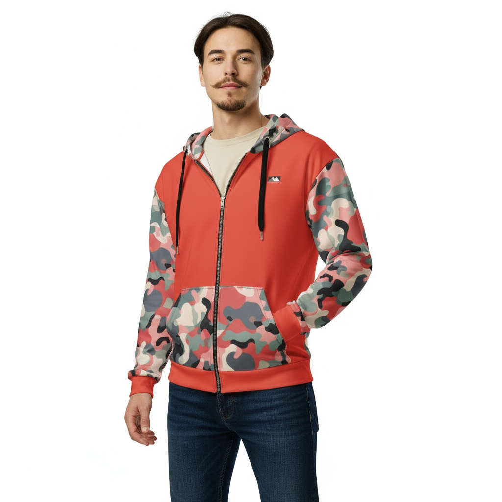 Stand out from the crowd with Alppeer's Quiver zip hoodie—a bold fusion of vibrant coral and modern camo that brings adventure-ready style to your everyday wardrobe. This recycled unisex zip hoodie features a striking coral orange body contrasted with pink-gray-black camouflage sleeves, hood, and pocket for a look that's anything but ordinary.