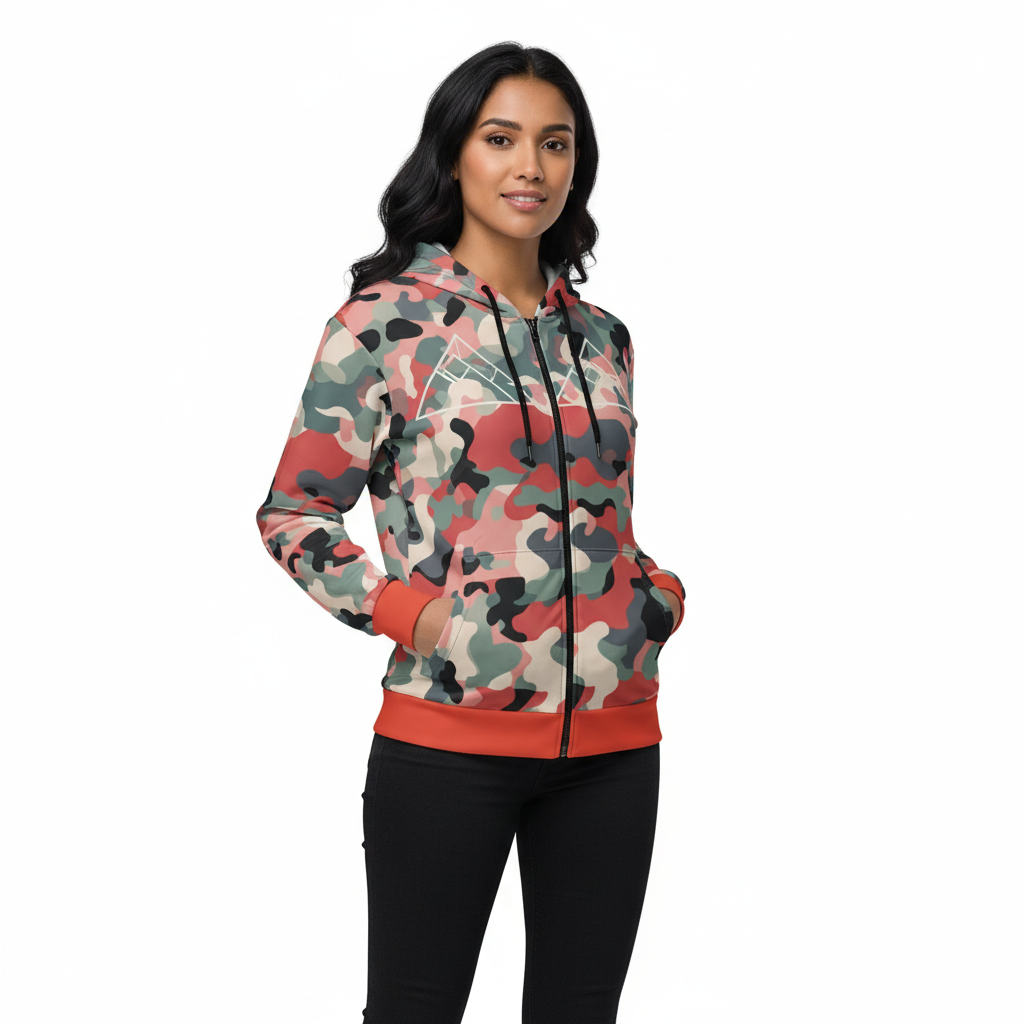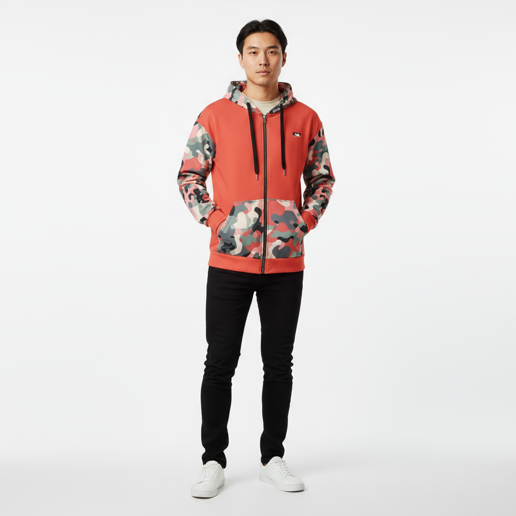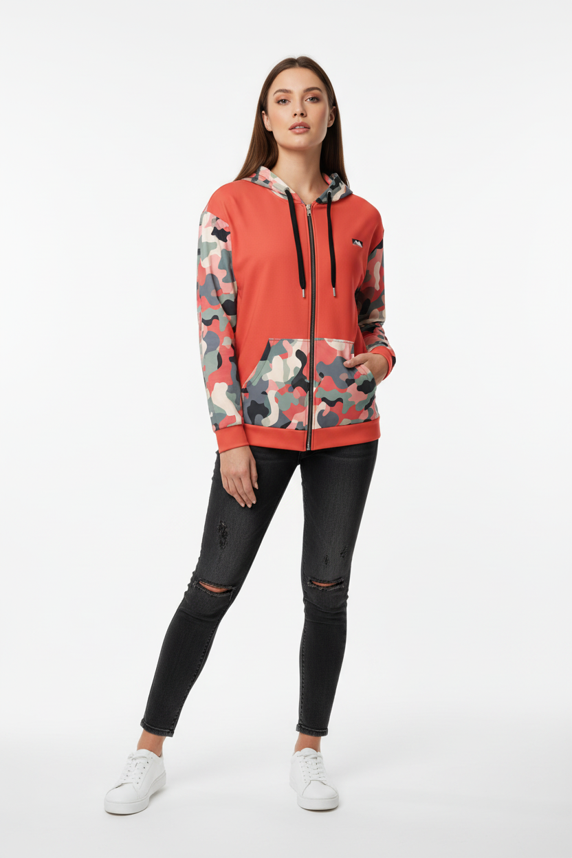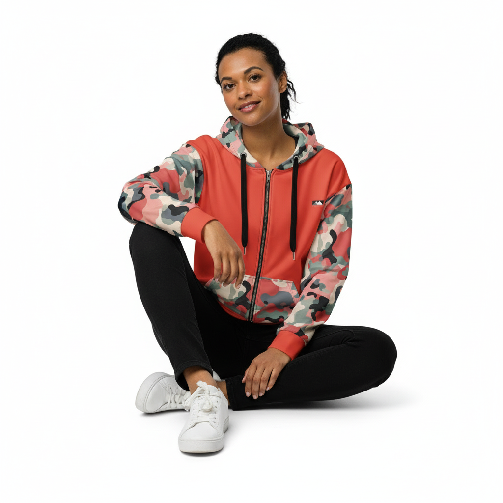Stand out from the crowd with Alppeer's Quiver zip hoodie—a bold fusion of vibrant coral and modern camo that brings adventure-ready style to your everyday wardrobe. This recycled unisex zip hoodie features a striking coral orange body contrasted with pink-gray-black camouflage sleeves, hood, and pocket for a look that's anything but ordinary.