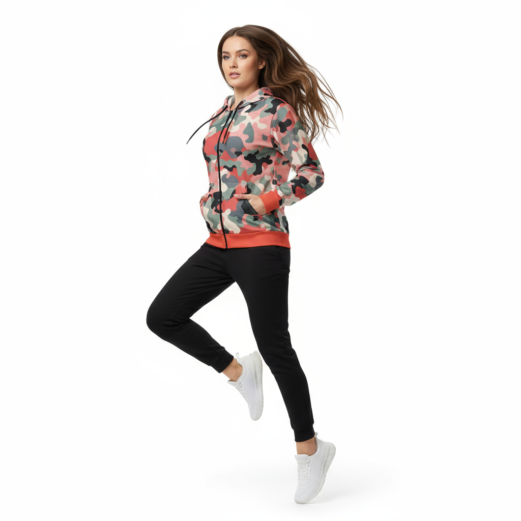 - Pink-gray-black camouflage pattern on sleeves, hood, and pocket