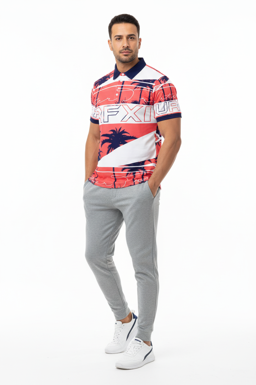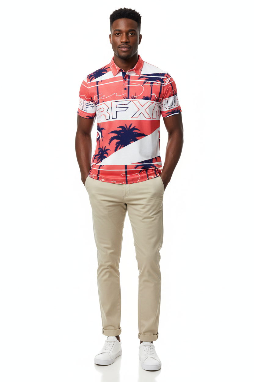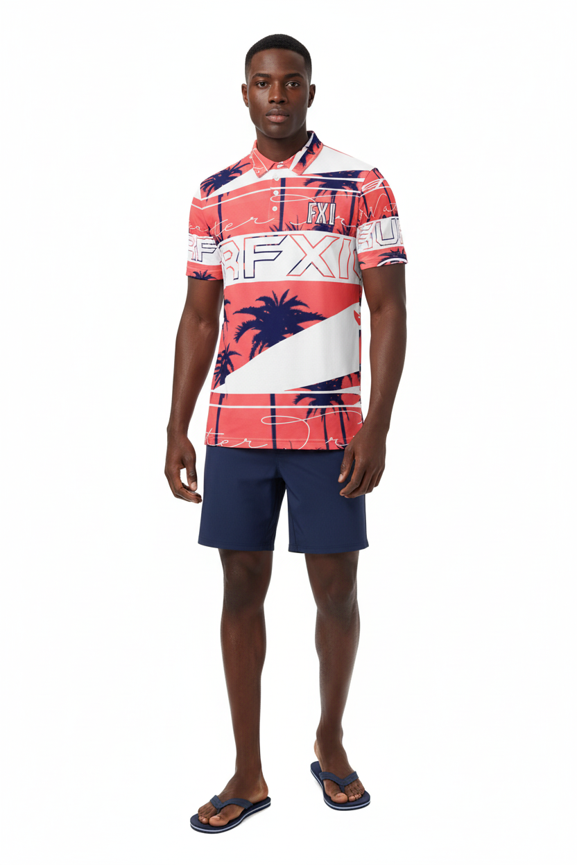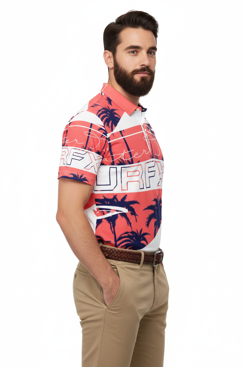 The Swell slim fit polo brings bold surf-inspired design to your everyday wardrobe. Featuring a striking coral, navy, and white palm tree print with geometric SURF X branding, this premium polo transitions seamlessly from beach to boardroom.
