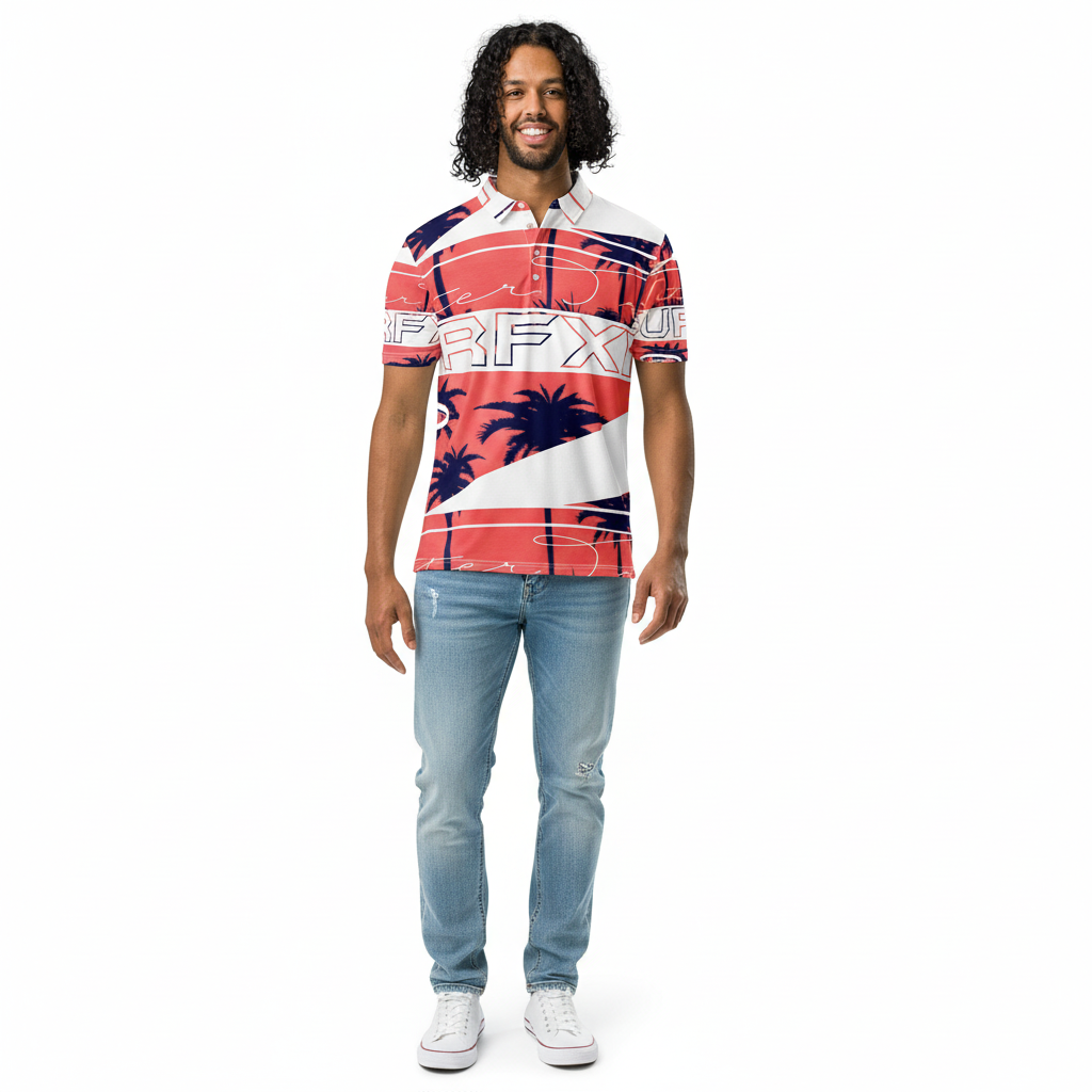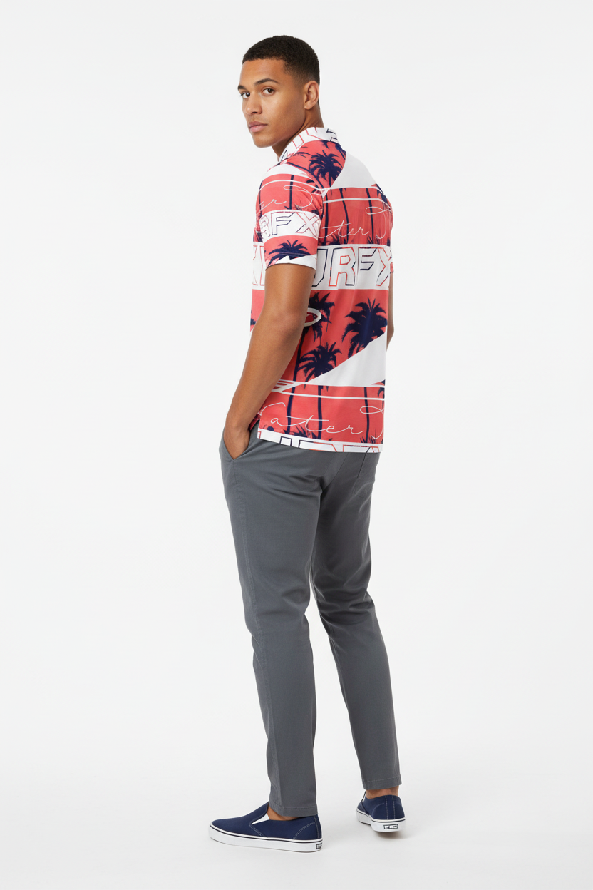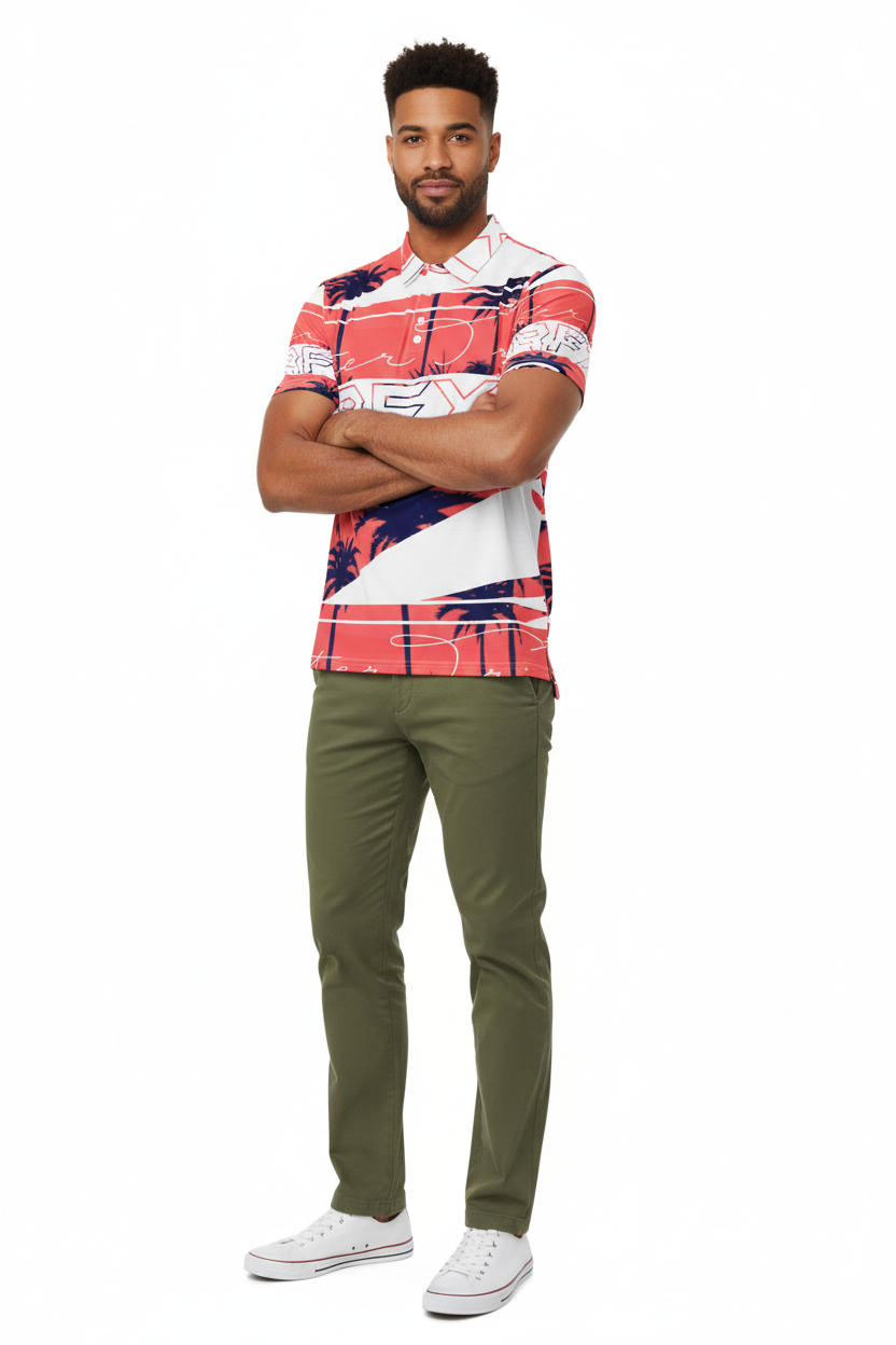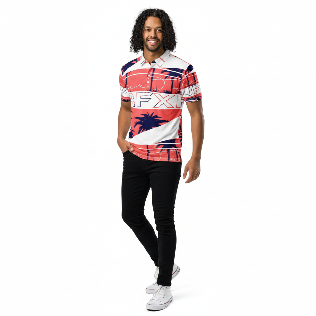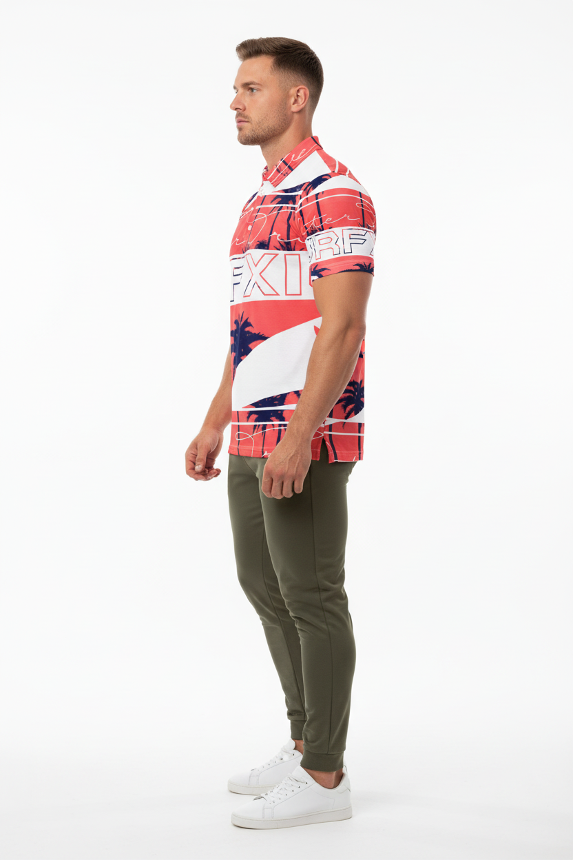 The Swell slim fit polo brings bold surf-inspired design to your everyday wardrobe. Featuring a striking coral, navy, and white palm tree print with geometric SURF X branding, this premium polo transitions seamlessly from beach to boardroom.
