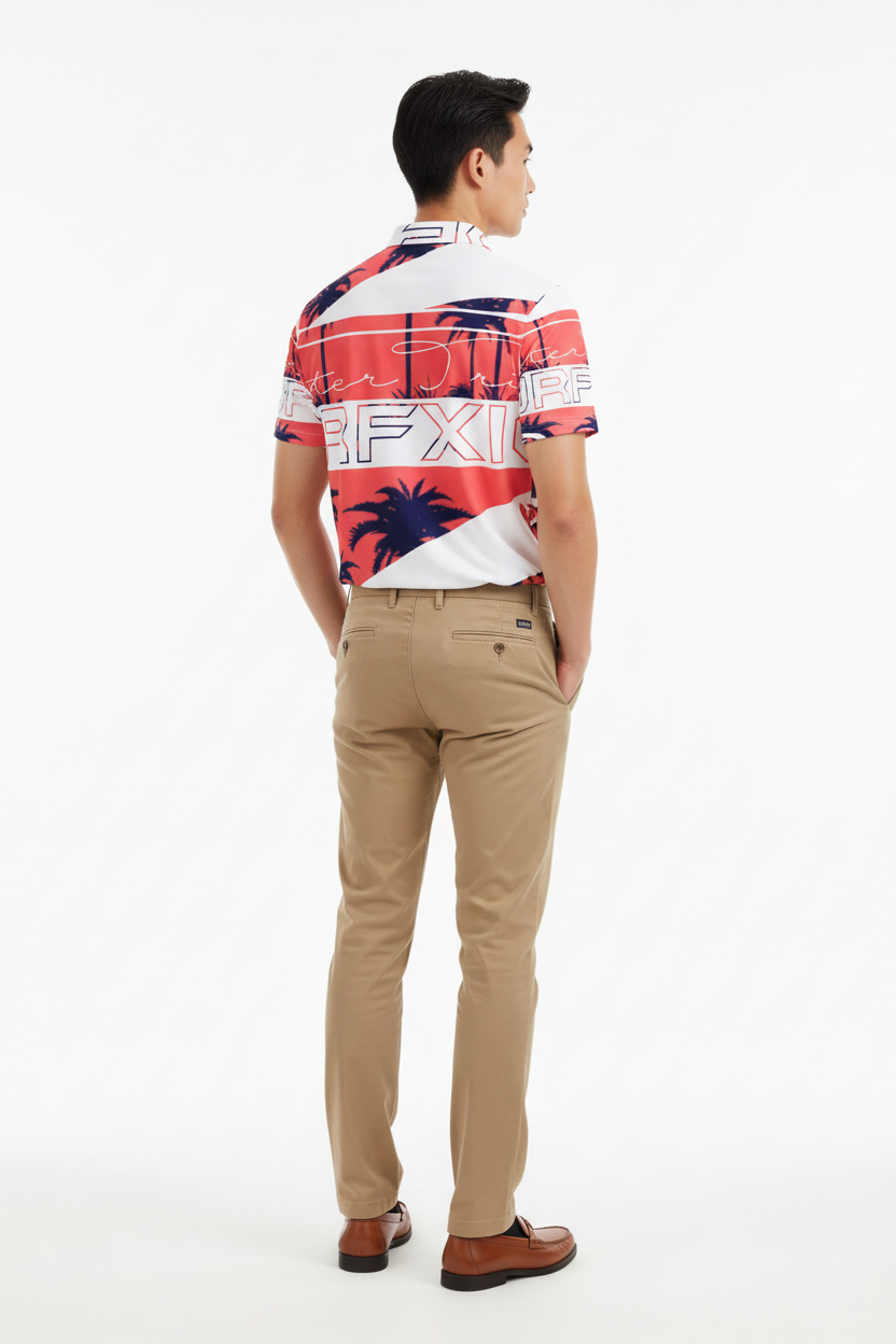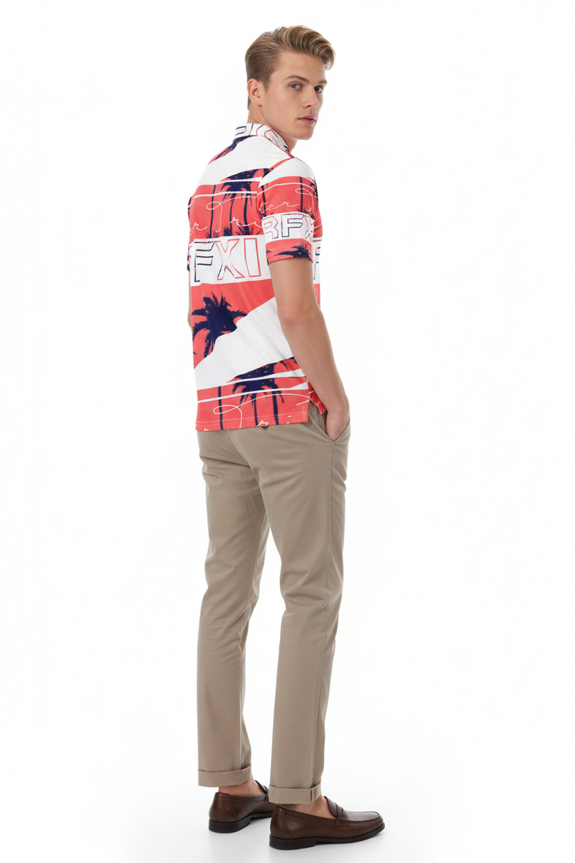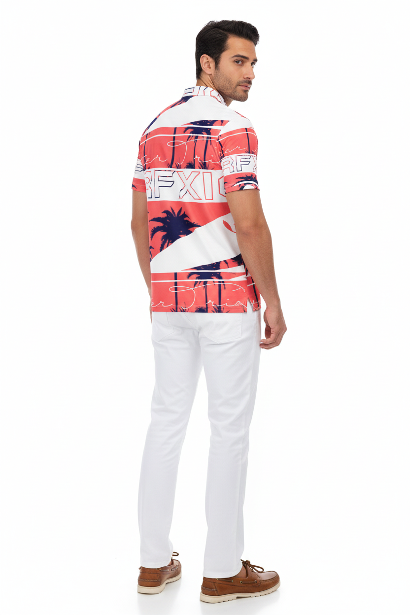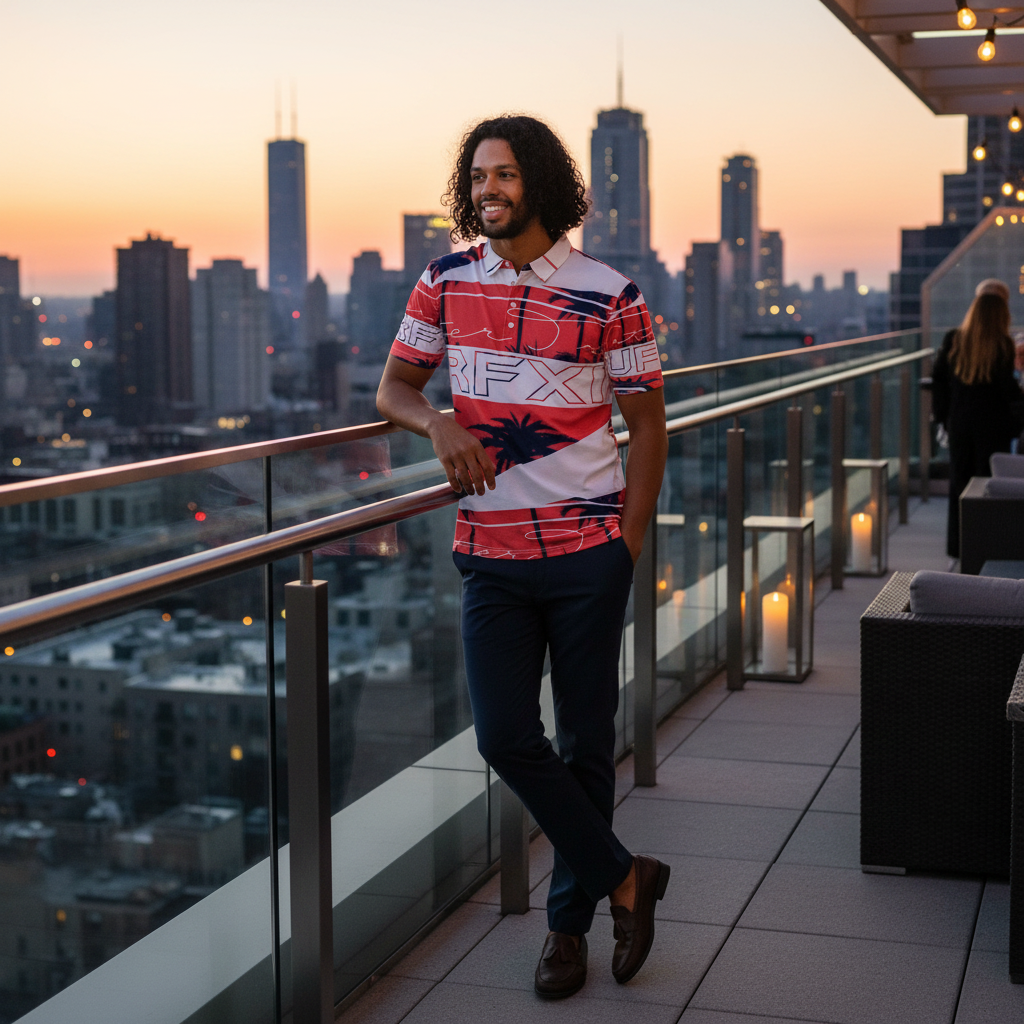 The Swell slim fit polo brings bold surf-inspired design to your everyday wardrobe. Featuring a striking coral, navy, and white palm tree print with geometric SURF X branding, this premium polo transitions seamlessly from beach to boardroom.