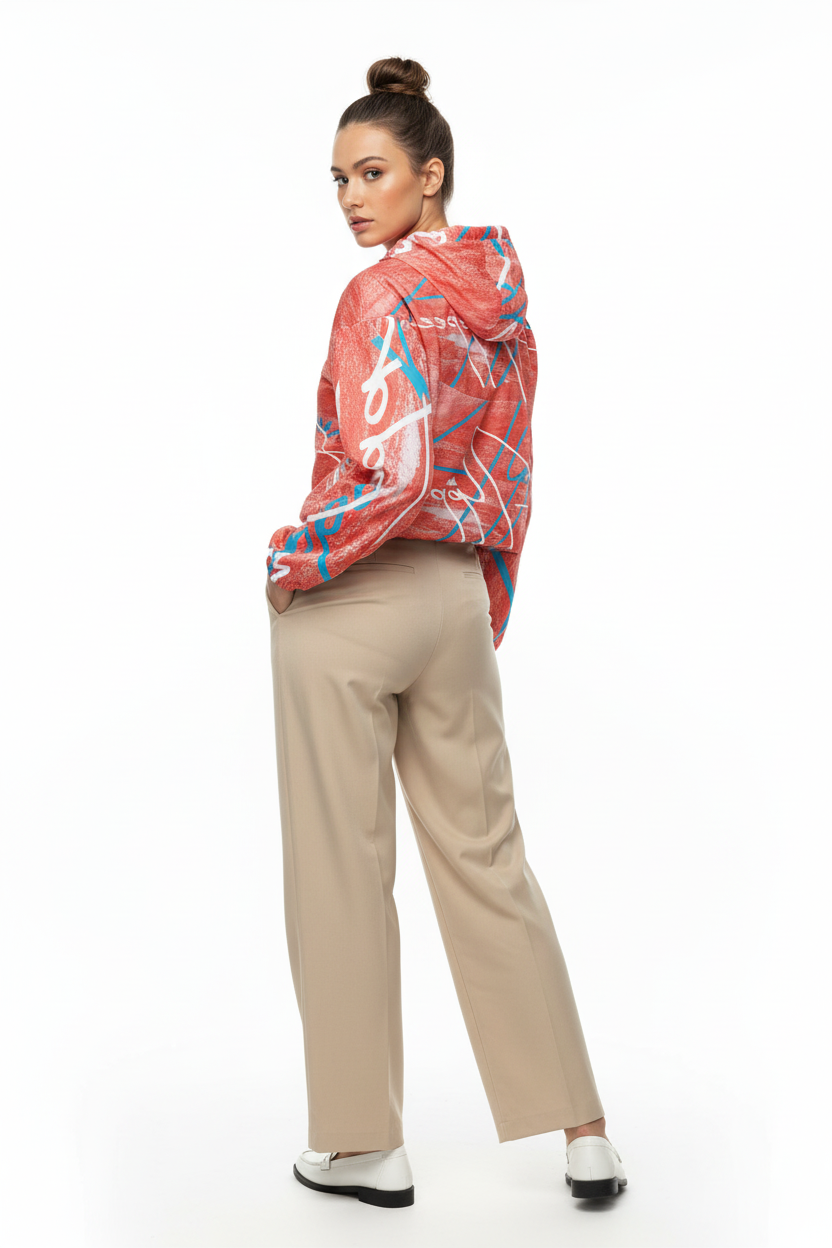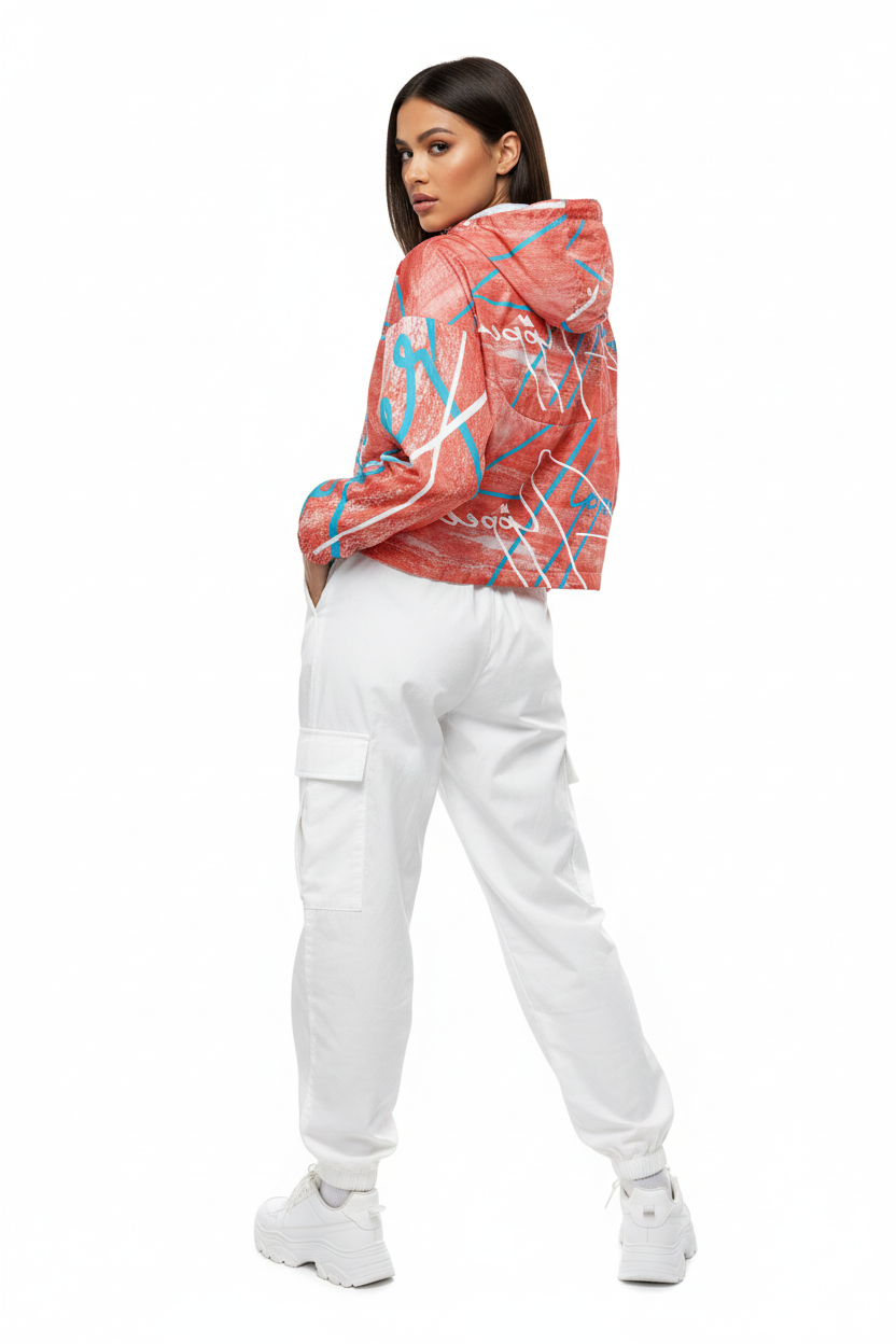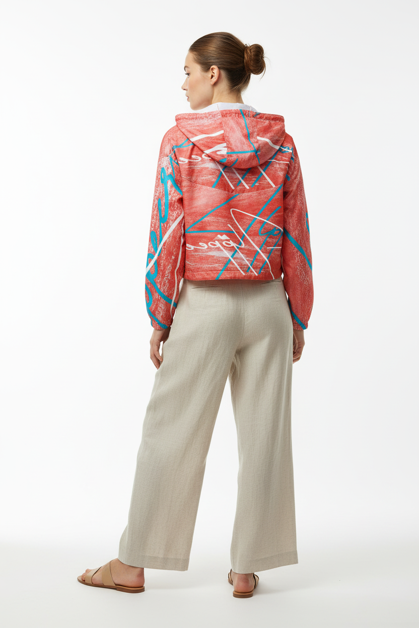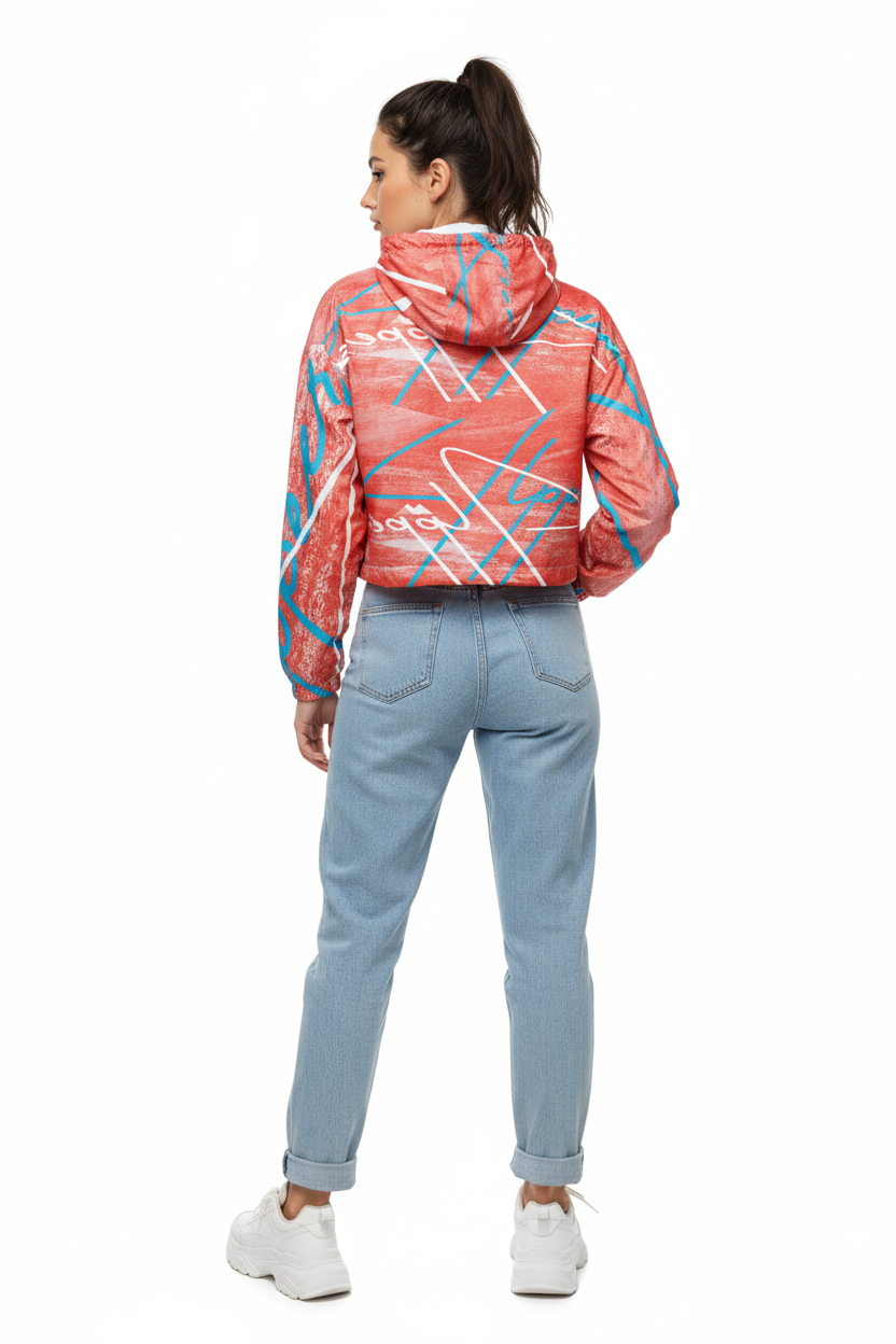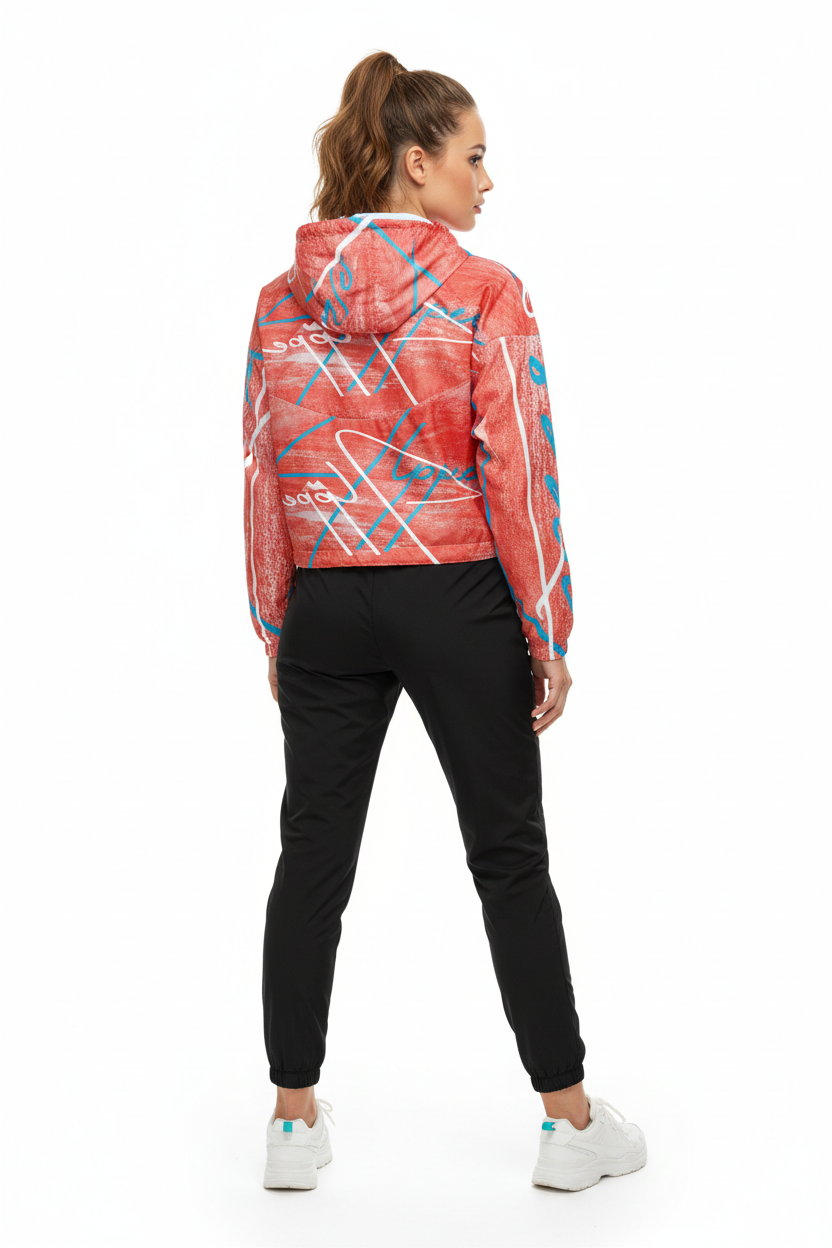 Make a statement on every adventure with this eye-catching cropped windbreaker featuring an artistic coral brushstroke pattern with bold geometric accents and turquoise details. The "Alppeer" branding adds editorial edge to this functional piece that transitions seamlessly from trail to street.