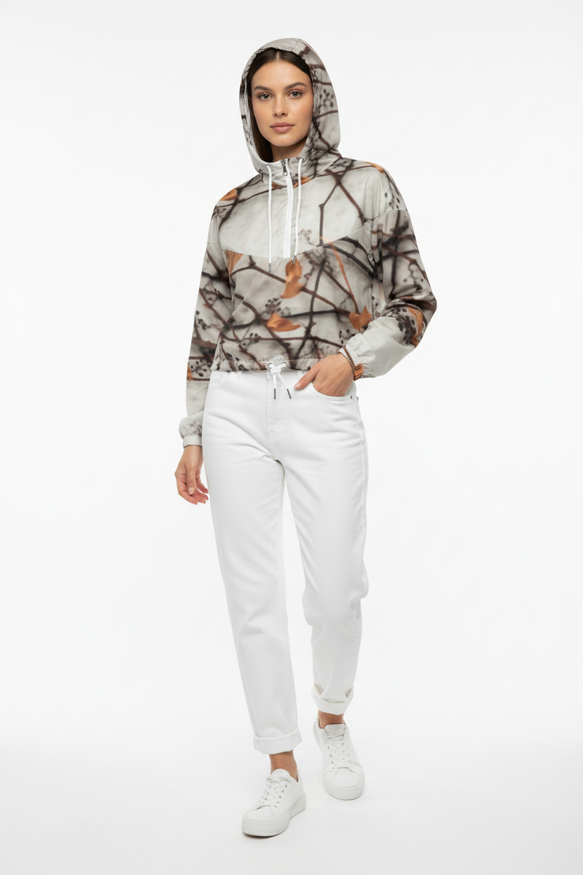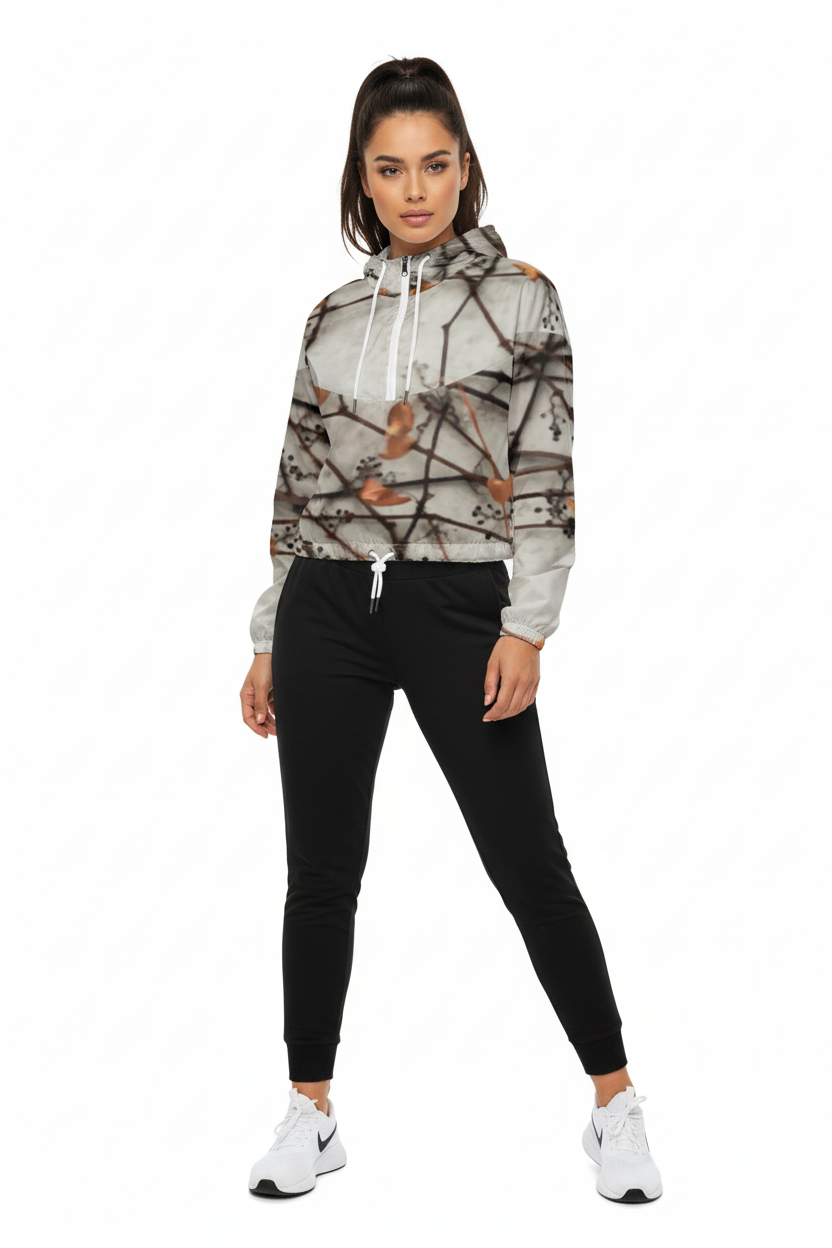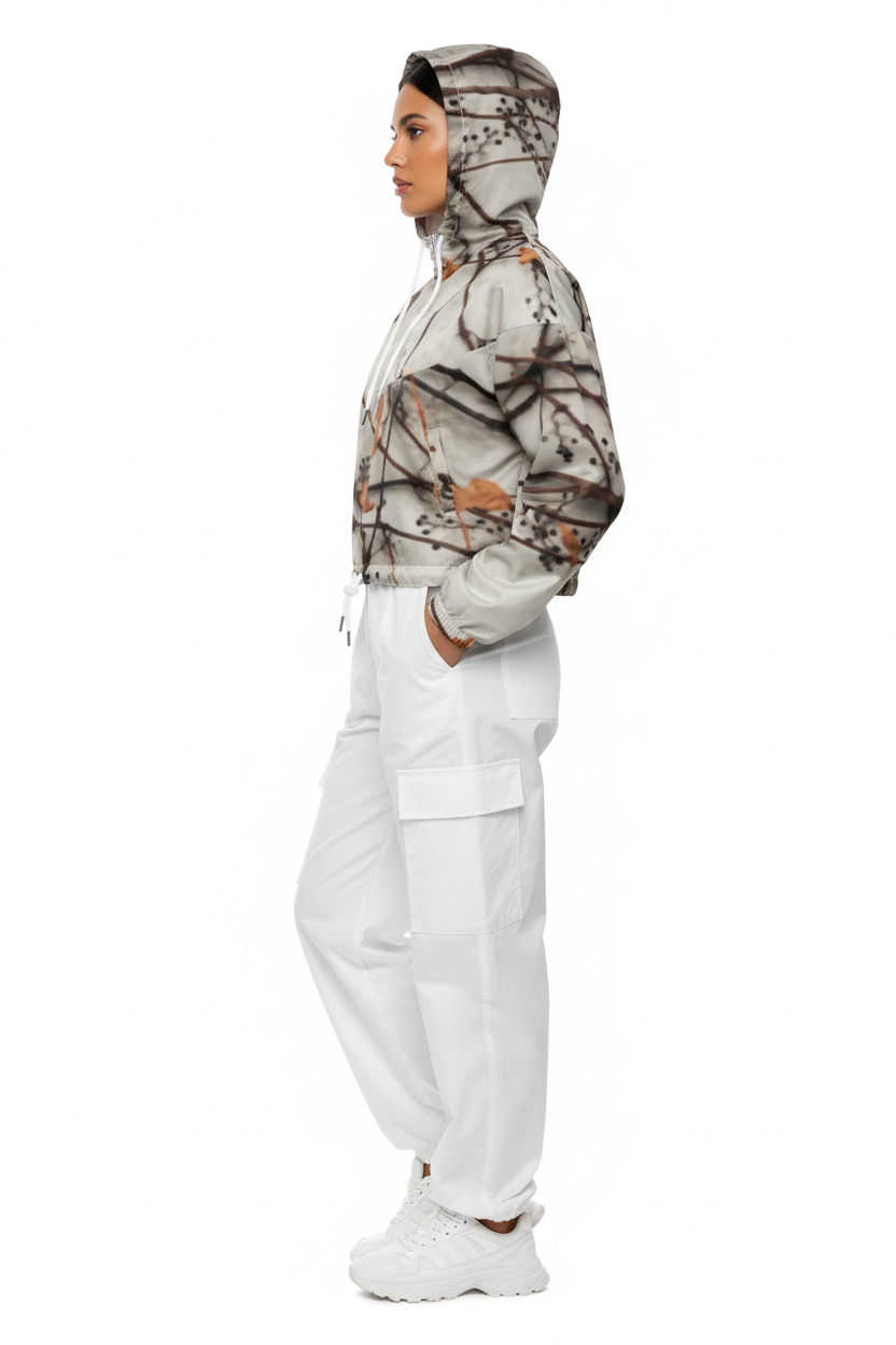 Embrace nature's artistry with the Botanical Drift Cropped Windbreaker, where organic beauty meets contemporary design. This striking piece features an all-over botanical print of delicate branches adorned with warm orange leaves against a clean white base, creating a wearable work of art that captures the essence of autumn's quiet elegance.