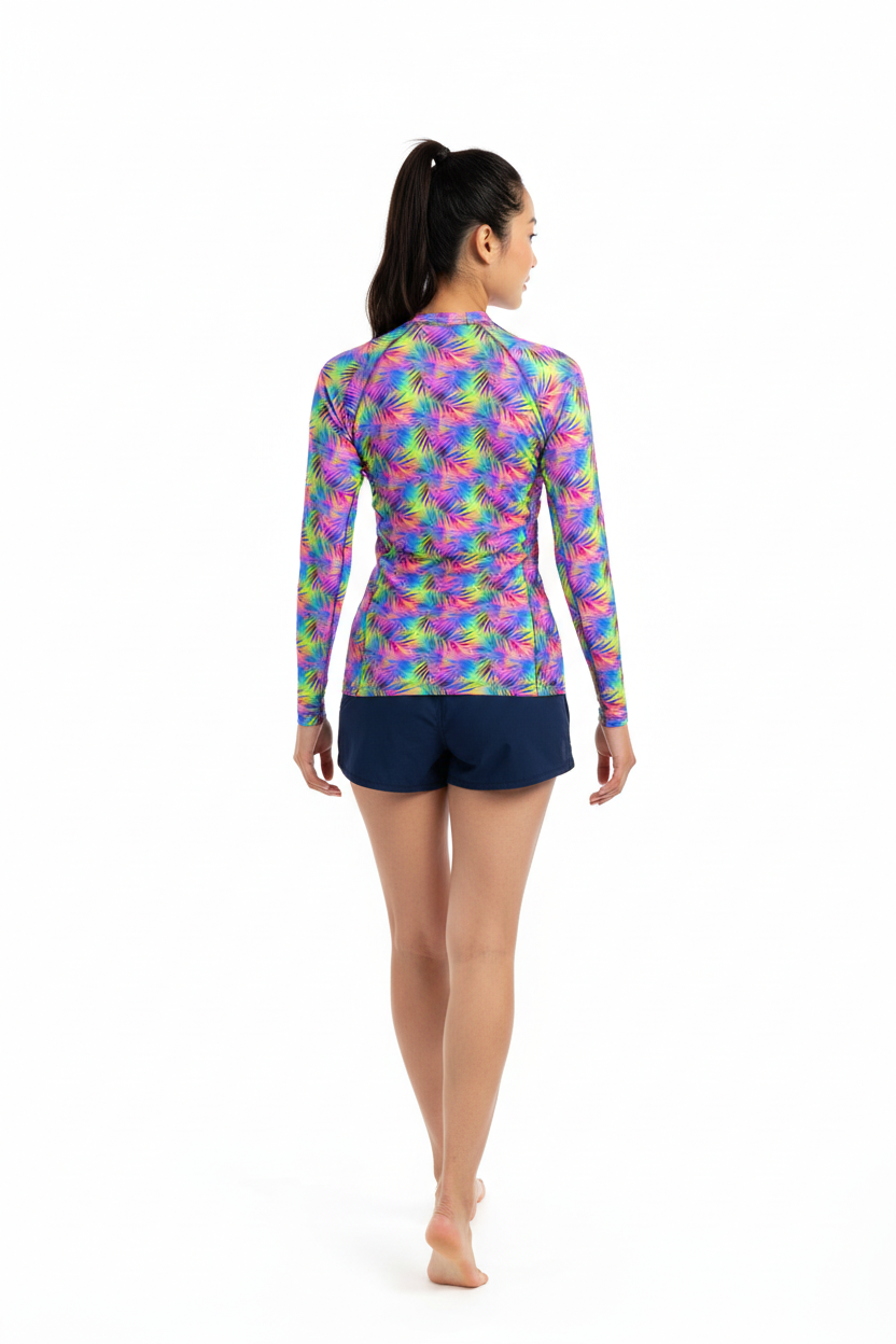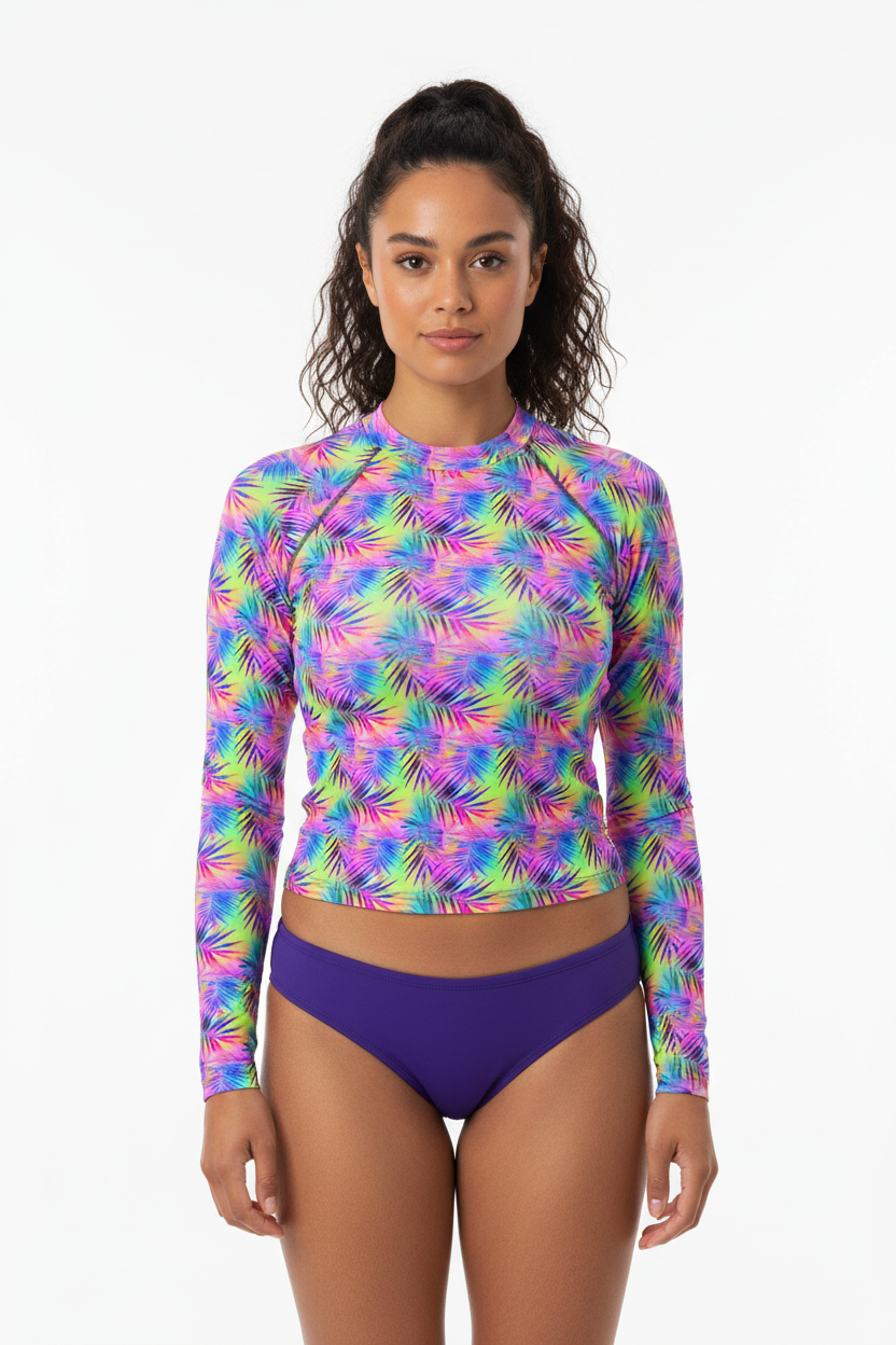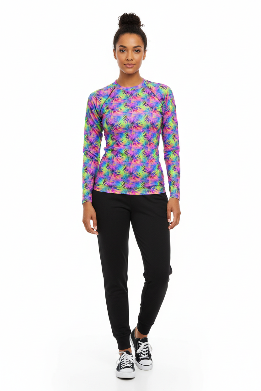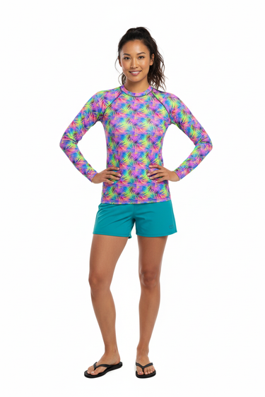 Dive into adventure with this versatile long sleeve rash guard featuring a vibrant tropical print. Designed for the active water enthusiast, this UPF-rated piece offers superior sun protection while making a bold style statement whether you're surfing, paddleboarding, or enjoying beach volleyball.