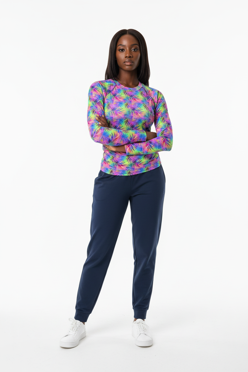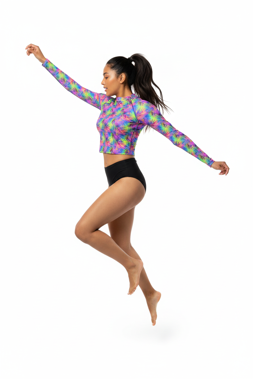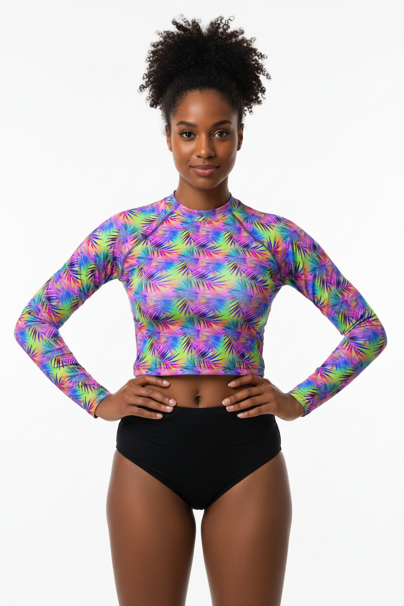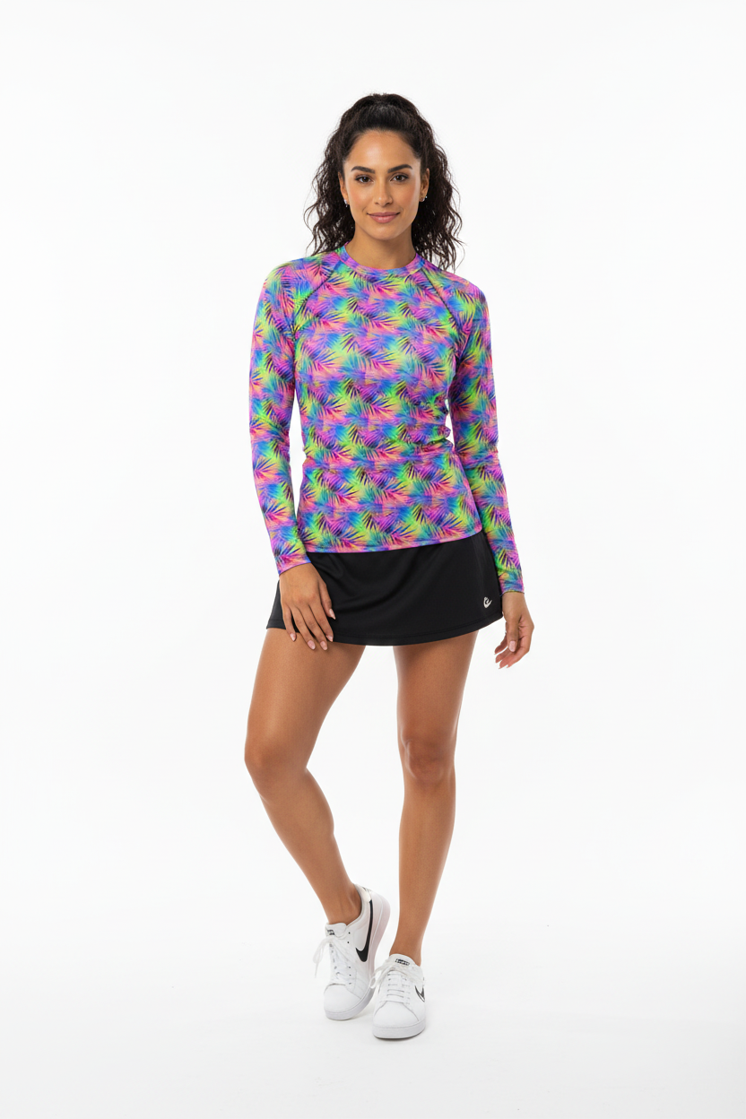 Dive into adventure with this versatile long sleeve rash guard featuring a vibrant tropical print. Designed for the active water enthusiast, this UPF-rated piece offers superior sun protection while making a bold style statement whether you're surfing, paddleboarding, or enjoying beach volleyball.