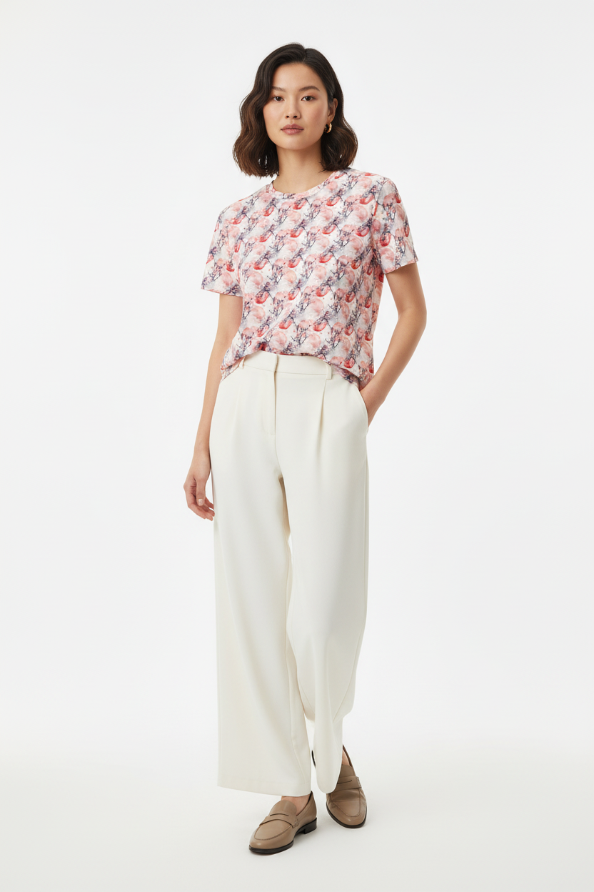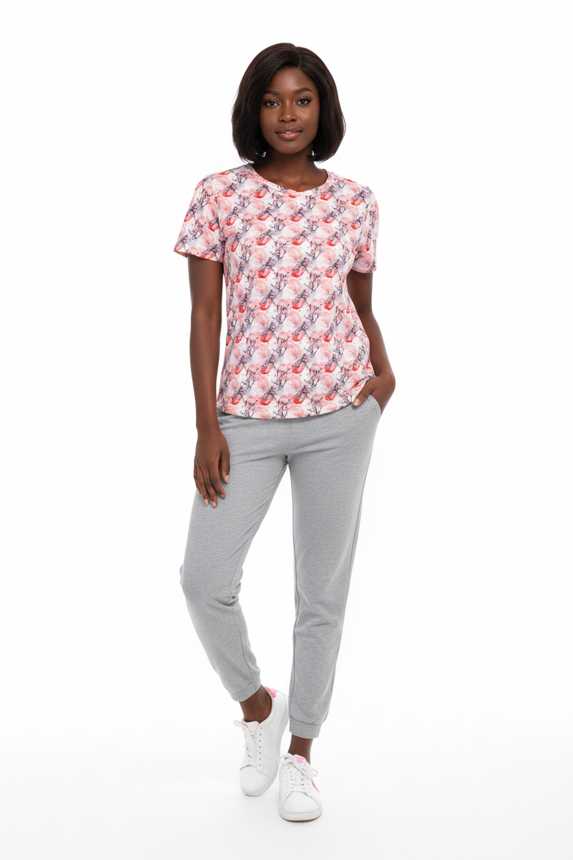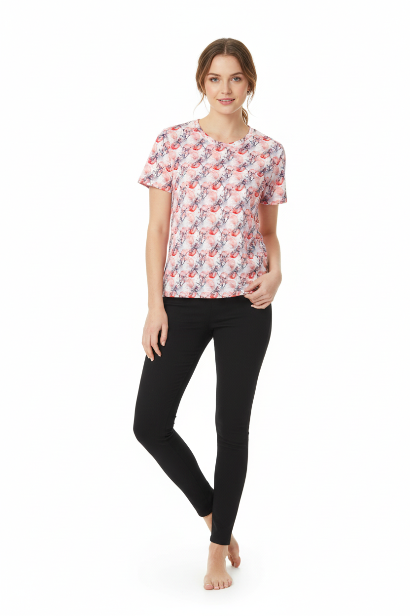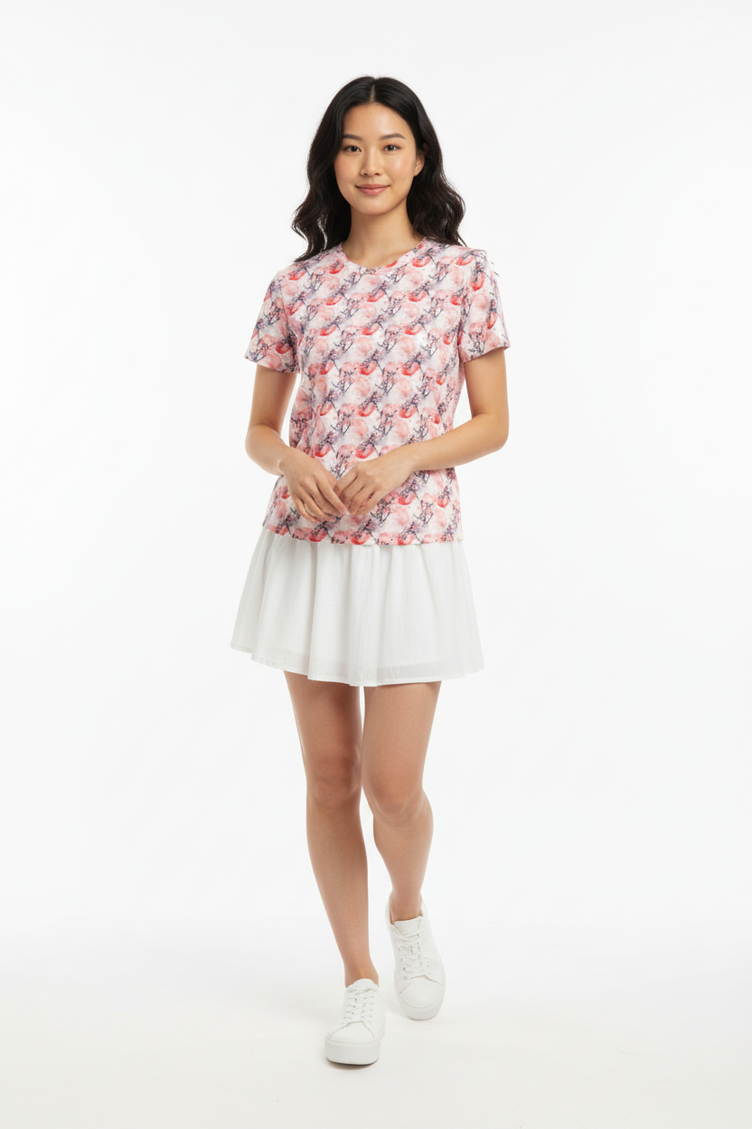The Cherry Blossom Crew Neck Tee brings delicate Japanese-inspired artistry to your everyday wardrobe. Featuring a soft watercolor pattern of pink cherry blossoms and red moons, this premium tee combines feminine elegance with comfortable, stretchy fabric that moves with you throughout your day.